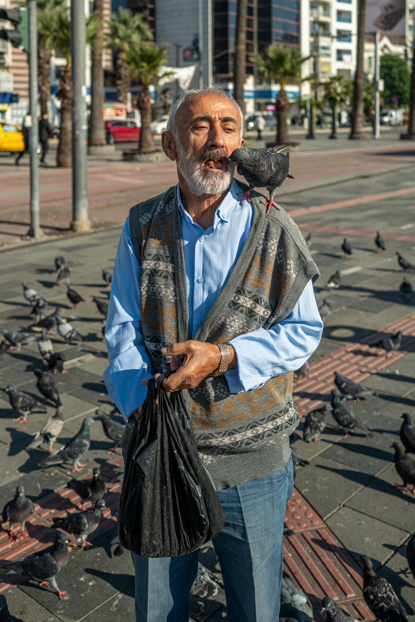 Wow! It must take a lot of work to train a pigeon to feed a man ... not to mention training the man to accept it. 😃