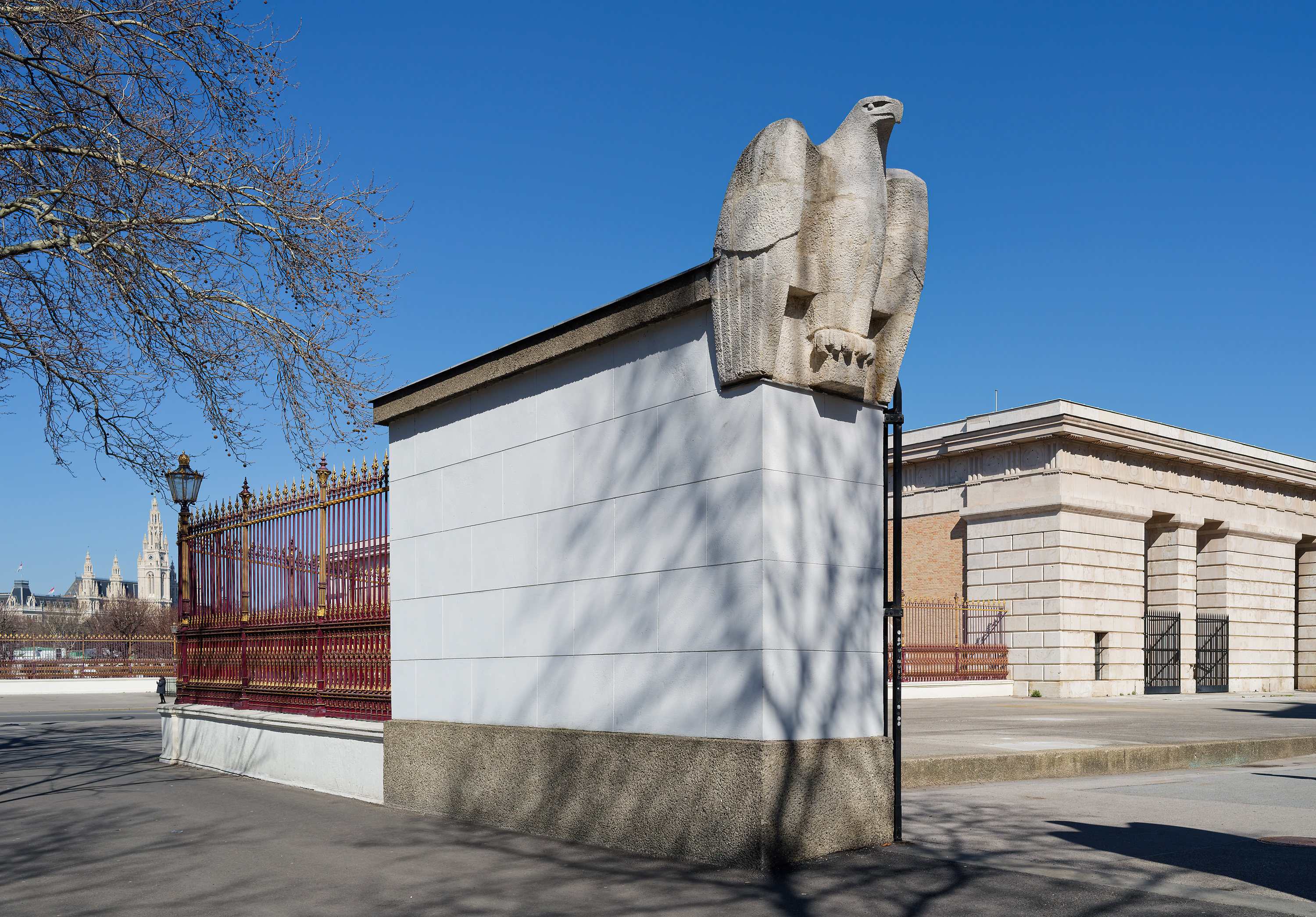 I do not know what this opening in the walls is for: we are looking into part of the parade ground, with the statue of Prince Eugene of Saxony (1663-1736) and the old palace in the background, the spire of St Michael's Church behind. I have always found the presence of these two eagles somewhat disturbing, dating as they must from the 1930s.