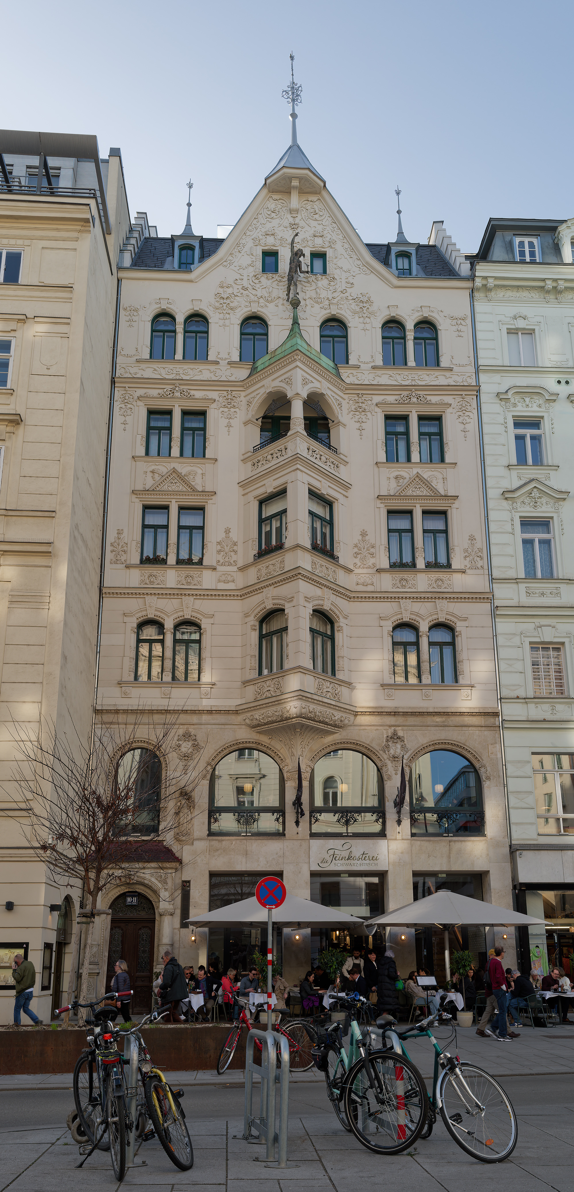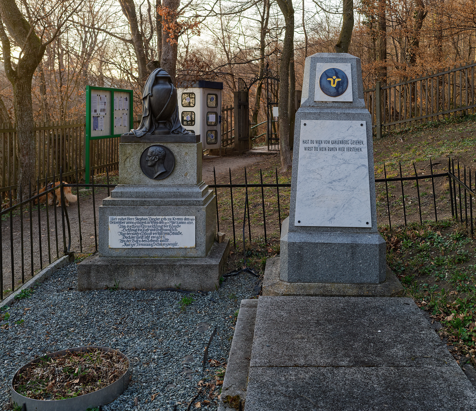 The grave with fabric draped over the urn is that of Stephan Ziegler, who was a silk merchant. The inscription on the grave stone to the right says: "if you have seen Vienna from the Kahlenberg, you will understand my peace here".