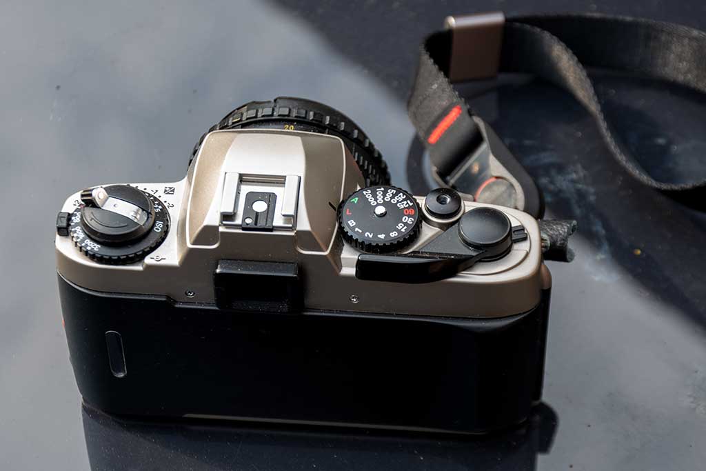 Compared to the FE the FE10 is much lighter. The viewfinder is not as large but it's perfectly usable. The back on the copy I had was badly scuffed - from new the FE10 has some thin rubber like material over a metal film door. However the scuffed material can be easily removed with isopropanol, leaving a nice silky metal finish. It suits a relatively large aperture prime - when I put a zoom lens on it again the viewfinder felt dark.