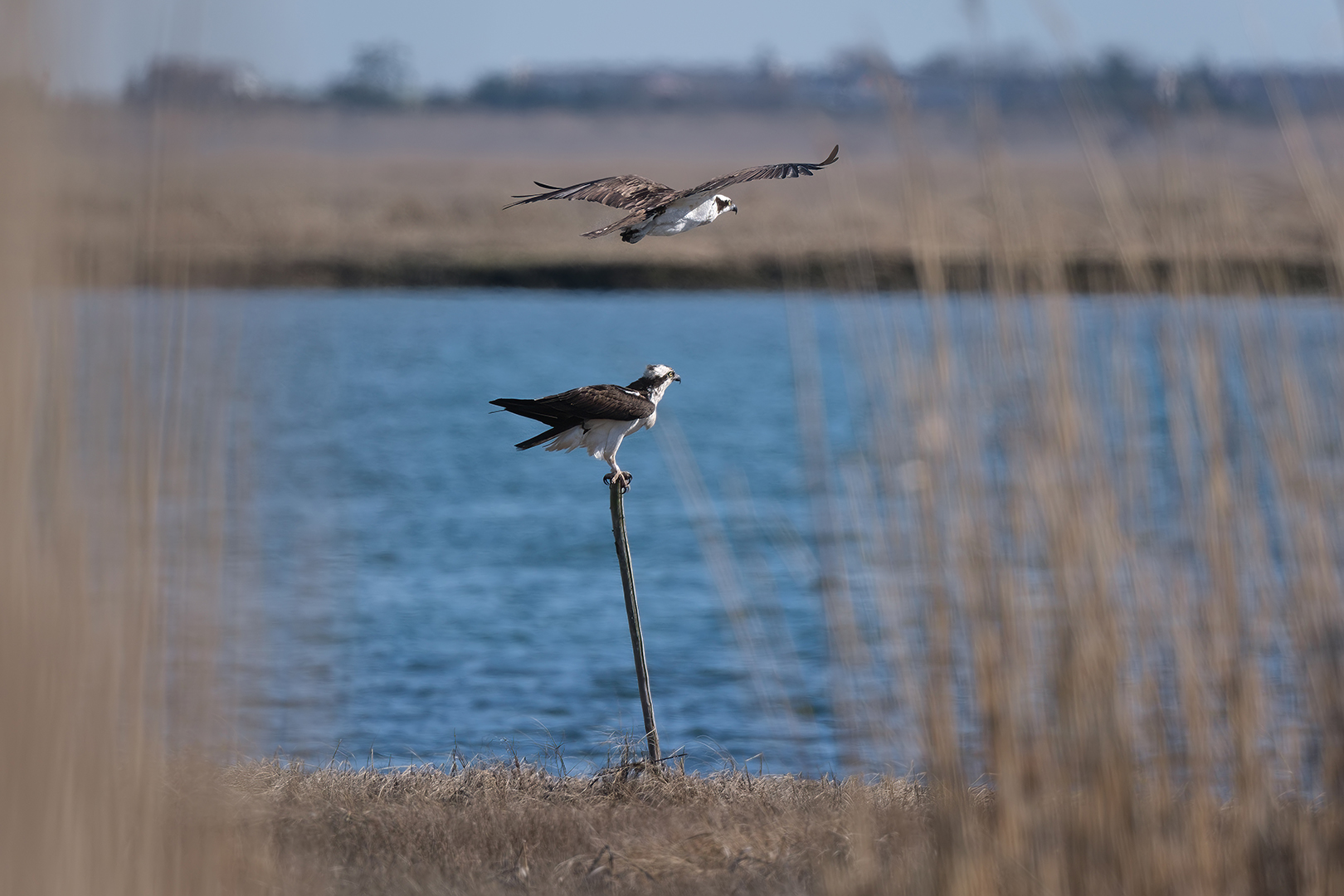 The osprey couple at the Marine Nature Study Area in Oceanside, NY has been getting along well. There is another male that has been trying to chase off the male and take over. I witnessed this as the male relaxed on a perch near the nest.