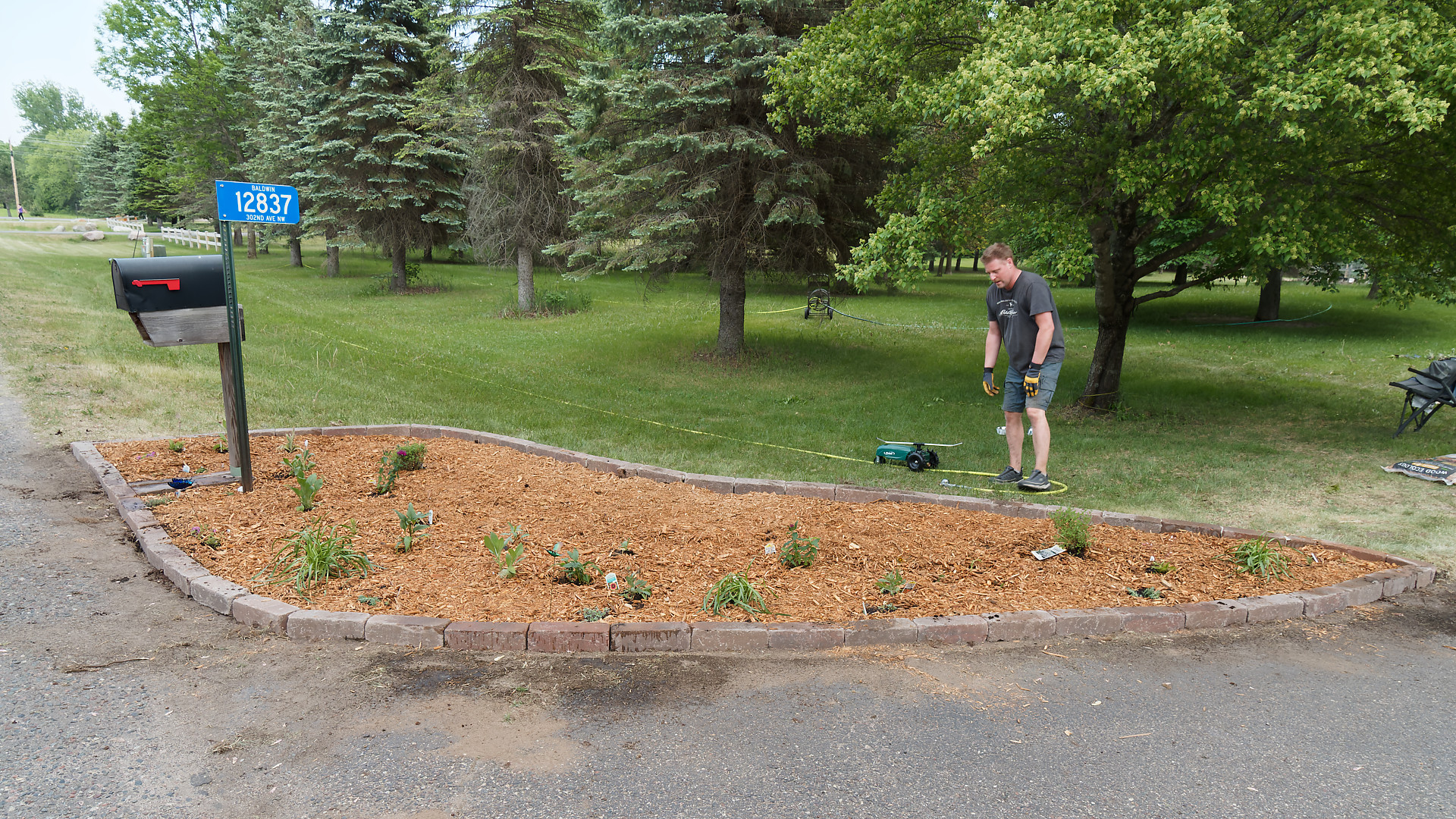 Will and I removed all the sod, built the brick wall (bricks glued together with landscape adhesive) filled it with bags of top soil and dug holes where the gals wanted to put plants. They planted other gardens until this was ready then stuck these plants in.