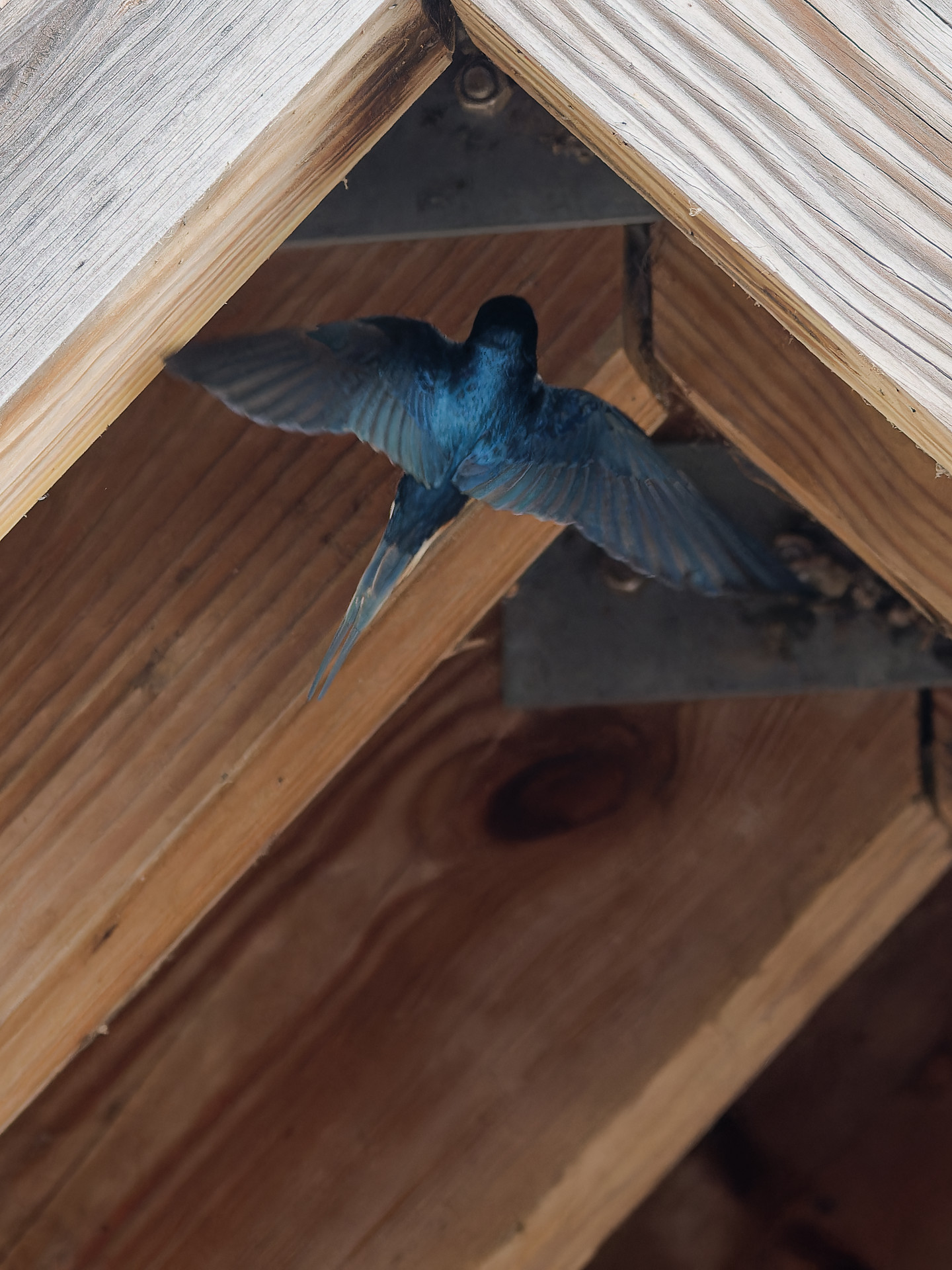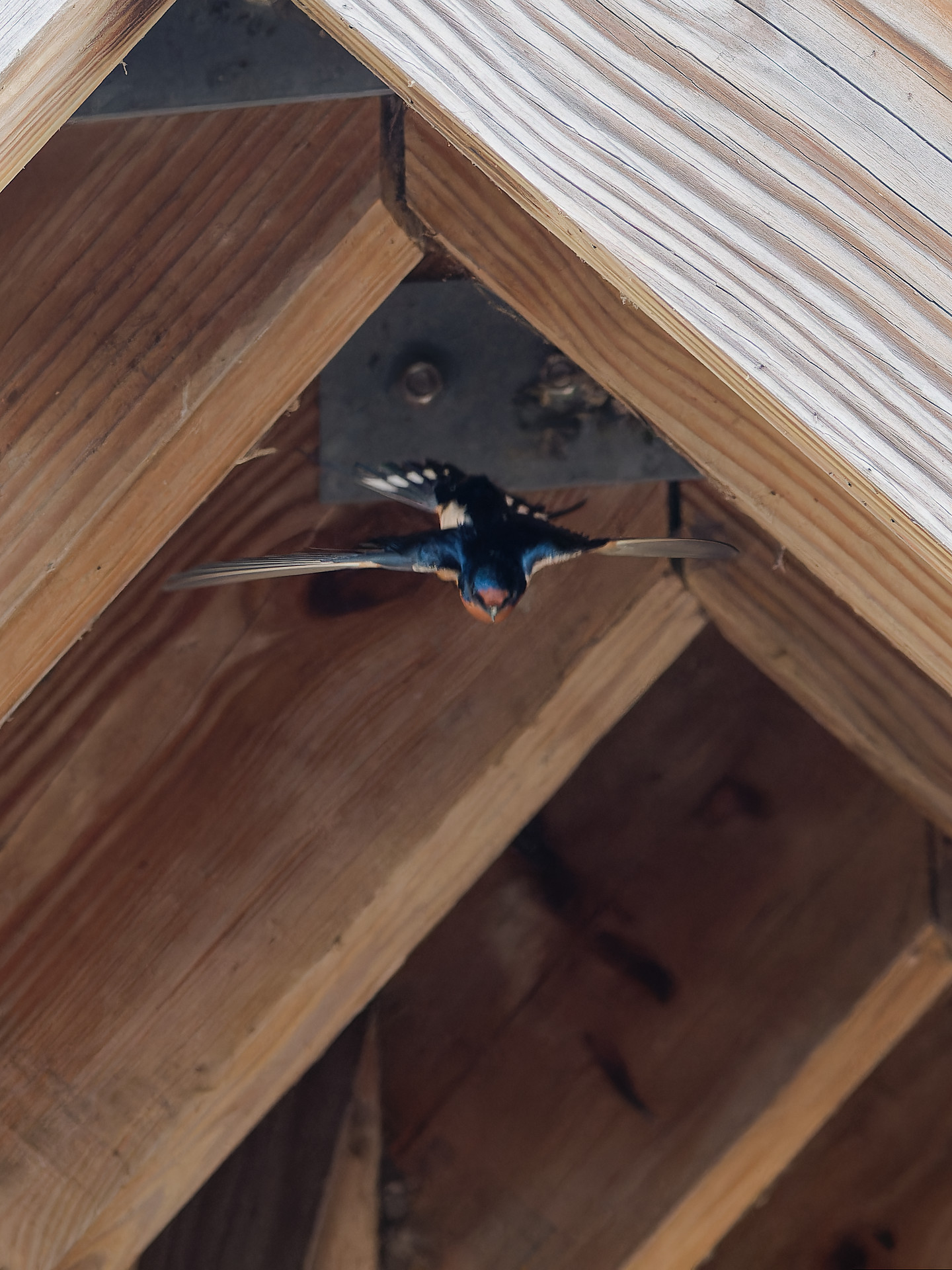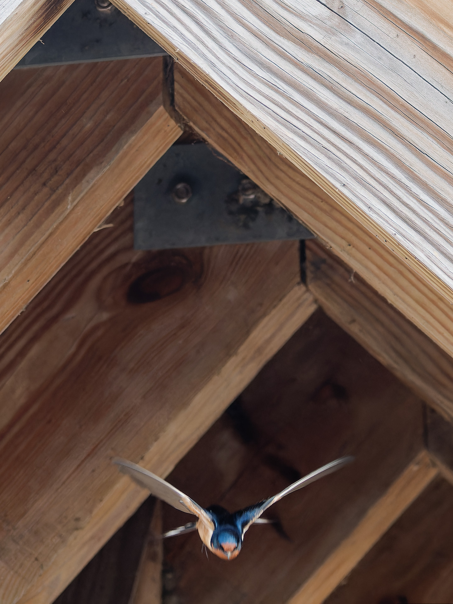 I went back and there were far fewer Barn Swallows and they were ranging farther. I wasn't fast enough to track them with their jerky flight paths, so I tried photographing them coming and going from the structure their nests are in. That was so dark, I had to lower my shutter speed so the shots didn't come out that crisp. Well, this young one crying "feed me" isn't too bad.