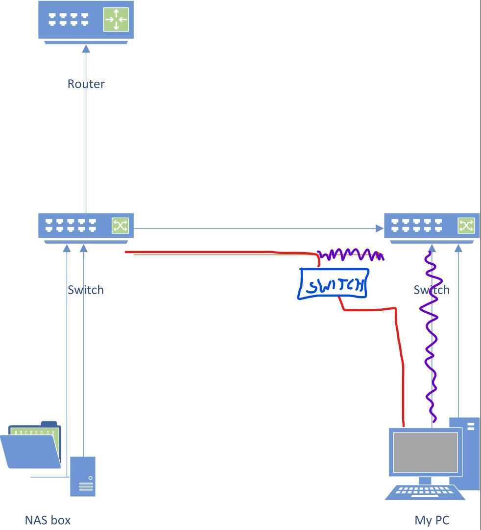 Thinking a bit more about this,... for SMB multichannel to work you need two (or more) separate paths for the data from the NAS to the PC. Your situation is complicated because there are 2 switches on route. The suggestion to connect two cables bewteen them seemed clear but that obviously doesn't work :-( ... apparently it creates data loops and the switches can't handle that.