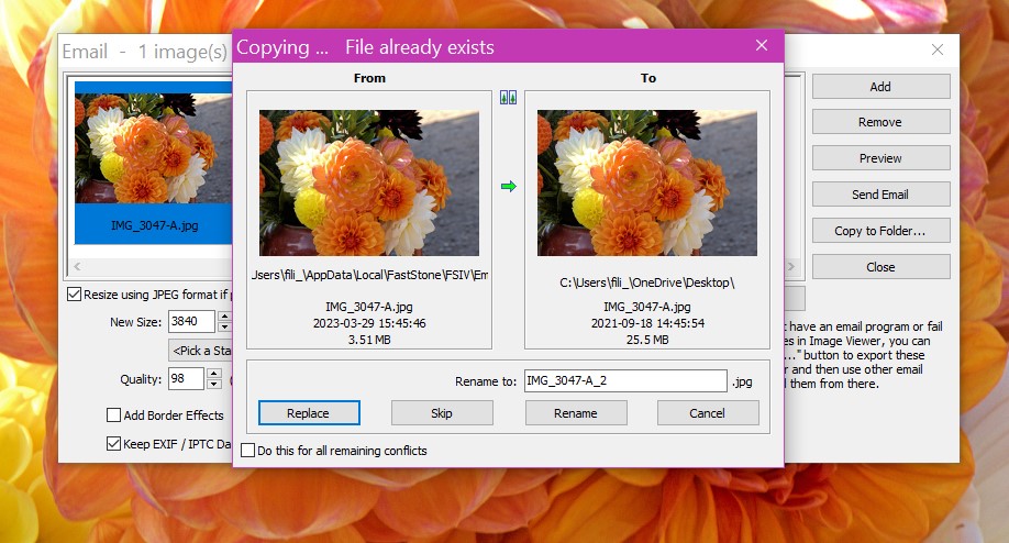 • If you are OK with the option to replace the desktop image you are working with (bearing in mind you still have the original) then go with it. Otherwise, you have both files with the option ‘Rename’.