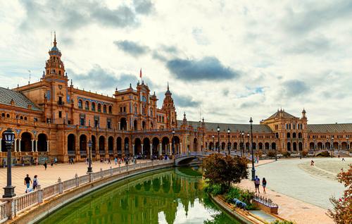 The buildings represent Spain's history and have a "strong Moorish" influence and were built for an "Iberio-American Exposition World's Fair" (I'm quoting wiki). The brick has a strong orange hue, with tile motifs that are blue, green and yellow. The Orange drowns out the colorful tile in most of the images I've seen, but the tile work really make this place interesting, so many patterns and colors! I tried to bring out the color in the tile by pushing the vibrance and pulling the saturation to keep it as normal as I could.
