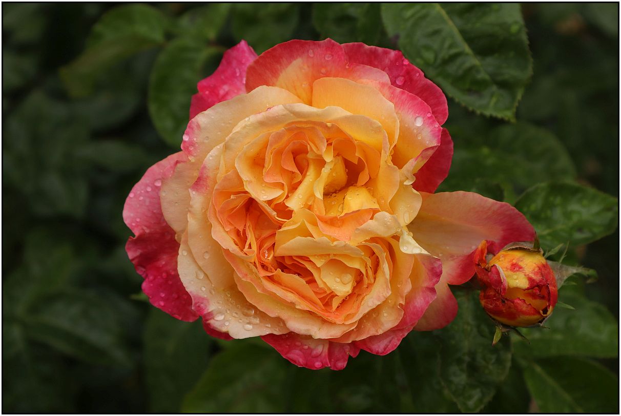 In Oregon where I live, we do not get a lot of rain in the summer. But this was an exception in late June of 2024. In the first two photos we saw storm clouds brewing as we traveled in a car towards the city of Portland. When we finally got to the Rose Garden it started to rain. It rained enough to sprinkle these rose flowers.
