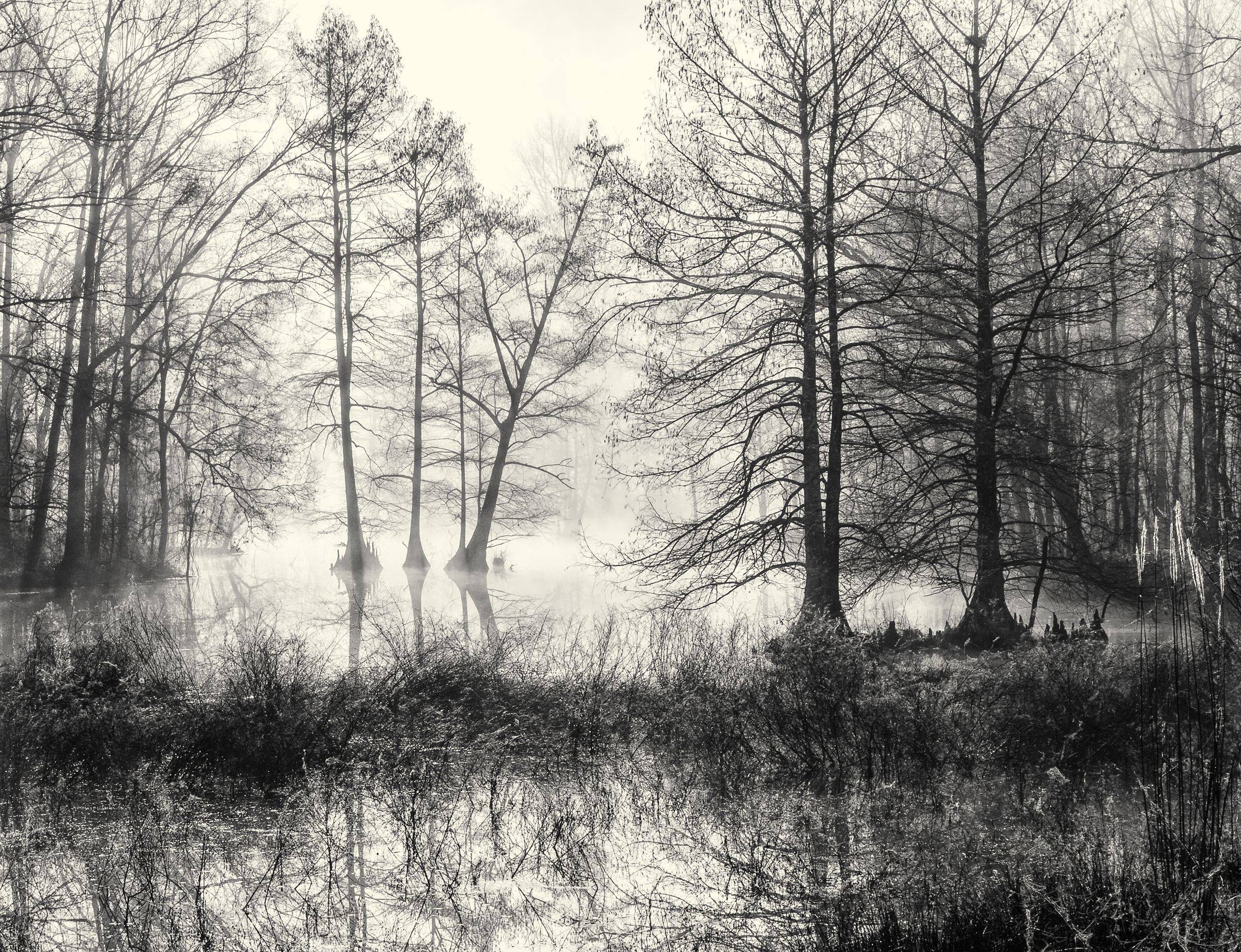 Another shot from the misty spell we had last week. This was taken after returning to the woods and following the river to find a fallen tree I'd photographed before. I did find the fallen tree and photographed it, but it didn't turn out as I'd hoped. However, along the way I found this little riverside scene that I really like. I'd originally intended to take the shot closer to the marcescent bush in the lower right, but that made the unadorned bush next to it far too prominent, so I took a couple of steps back and found this composition, and the other bush I was now embedded in.