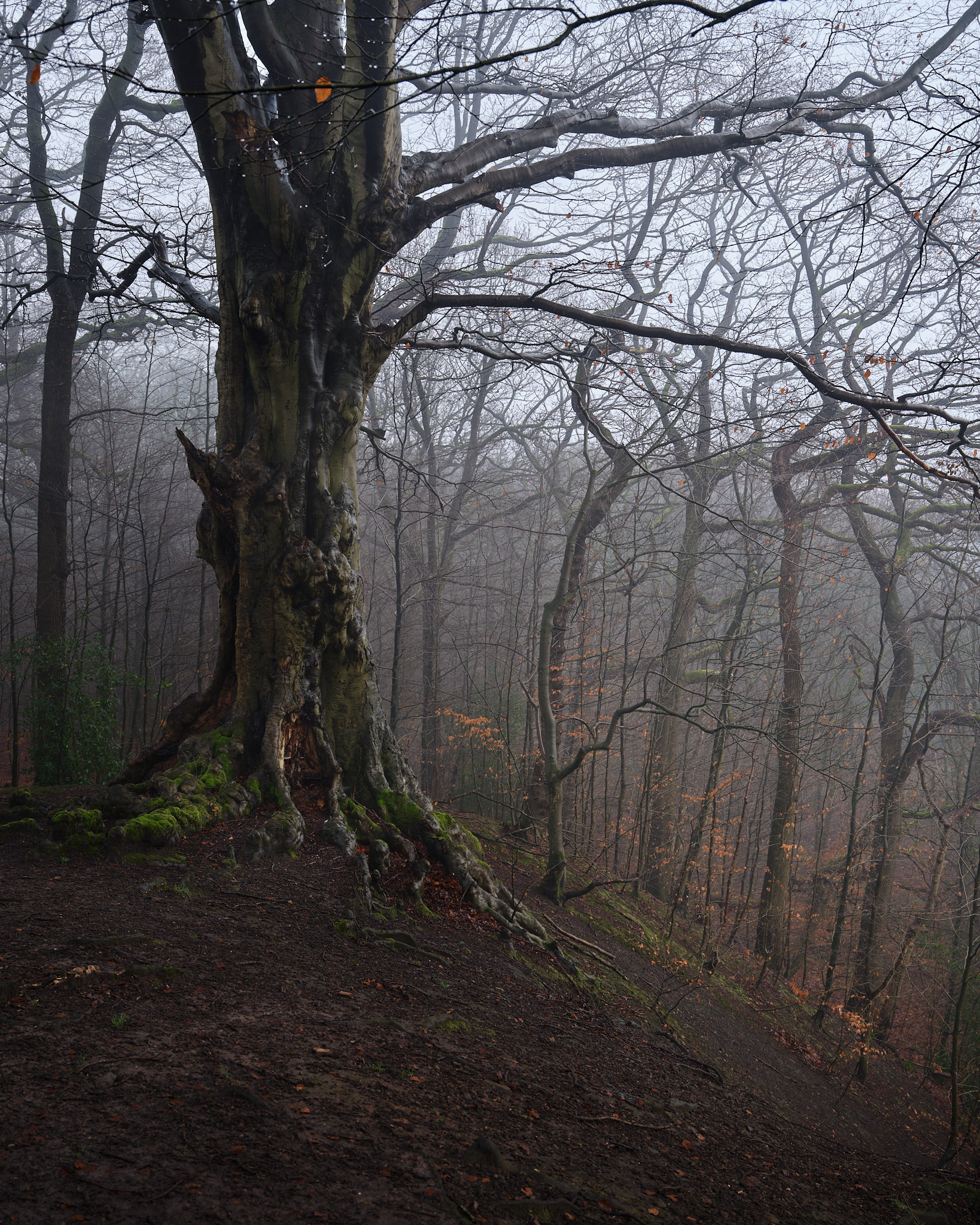 I discovered this creepy tree just round the corner in the same woods as the one pictured previously. While the previous shot was at sunset, this was mid afternoon on an increasingly drizzly day.