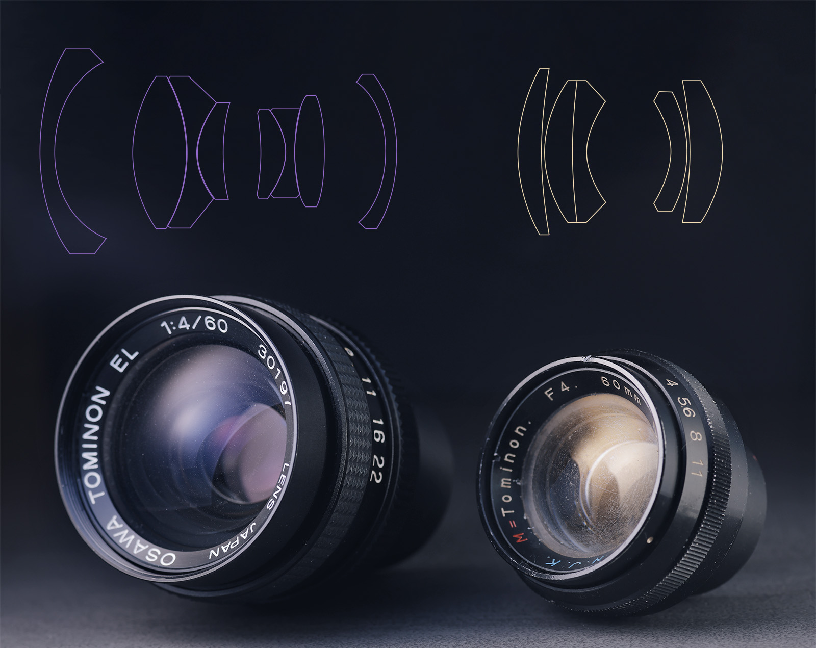 But while it does share the specs (and it‘s not unfathomable that the N.J.K lens might have been created as an early prototype design in the Osawa Tominon EL series) these lenses have a completely different optical design. The Osawa is a very unusual 8/4 Biogon/Super Angulon WA variant and the 60/4 N.J.K. Tominon a 5/4 Xenotar (like the Macro Yashinon or Zeiss S-Planar 60/4). No lens in the Osawa Tominon series has such a design as far as I know.