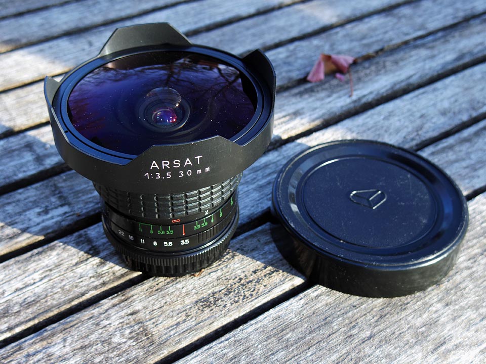 A fisheye lens from the other end of the size spectrum. An Ukranian made Arsat 30 for the Pentacon 6 medium format film camera. I use the lens with a P6 to Pentax 645 adapter. The lens is large with the front element being about 110mm. It is well built, but the adapter is a little lite weight and care must be taken when attaching or detaching the lens. It performs well when stopped down some. Rear of lens is threaded for filters and as ususal a filter must always be in place since it is part of the optical system. I only have the clear filter. Need to hunt down some others.