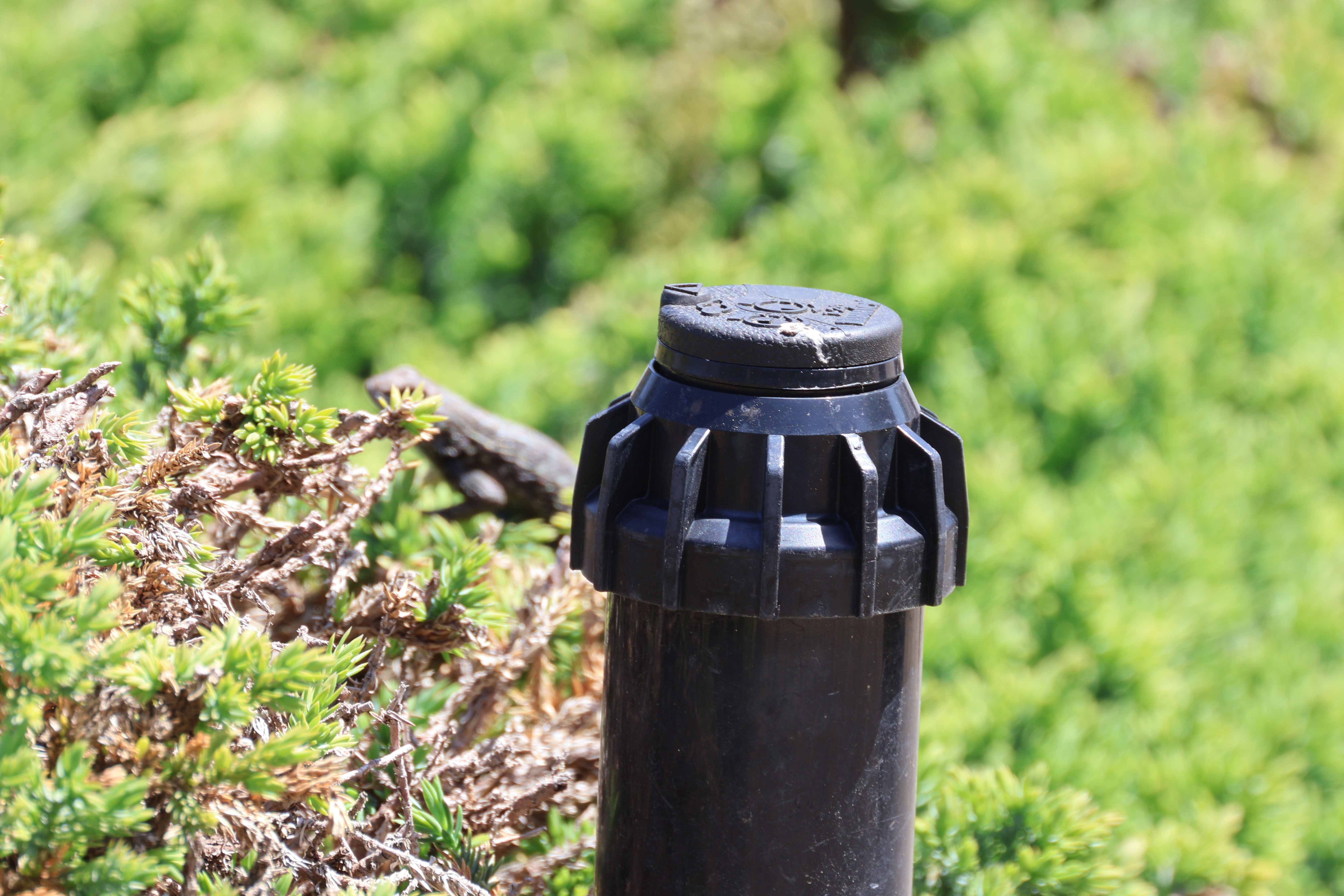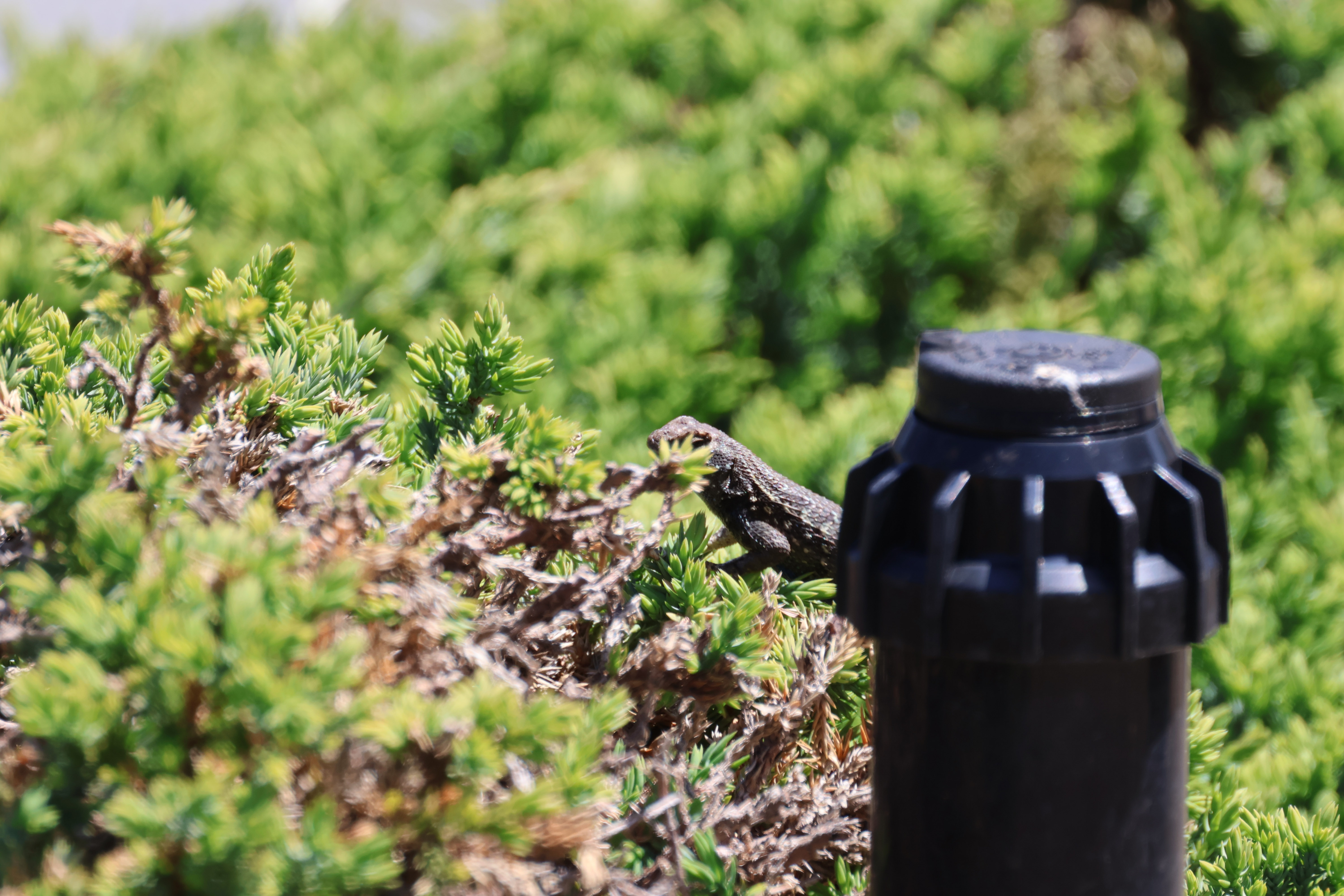 Finally when I realized there was a lizard back there, I took an Av shot focused on the lizard, which does show that the sprinkler head isn't in focus.