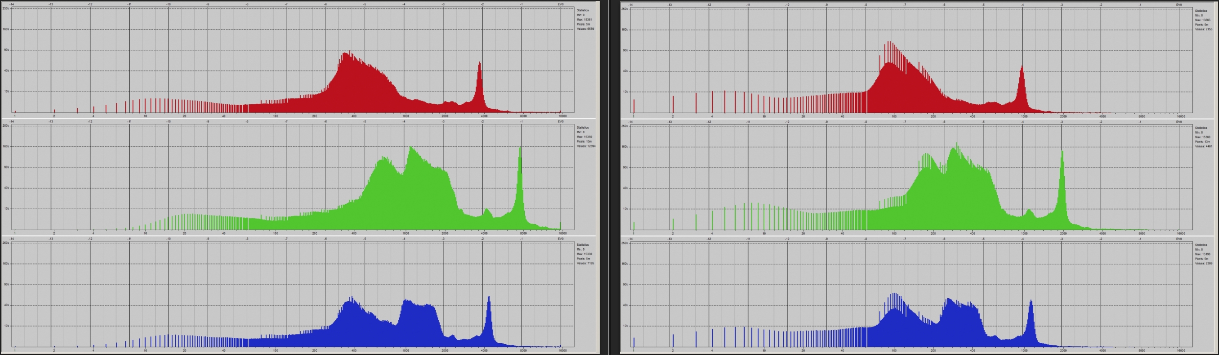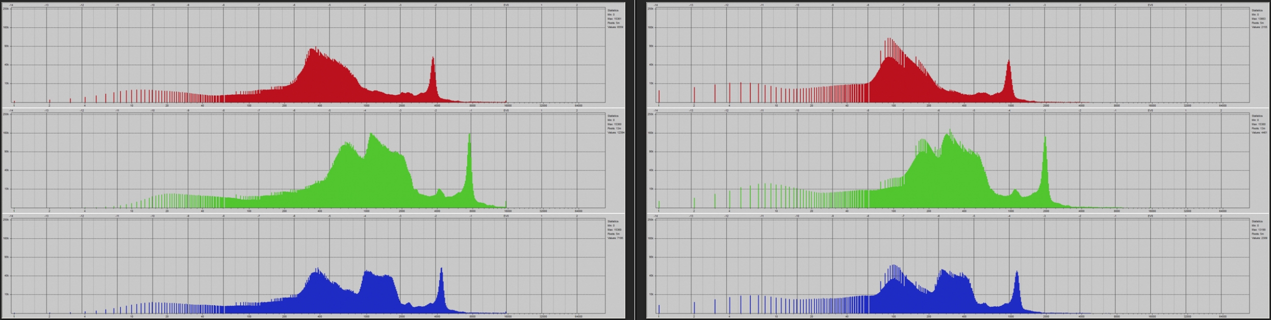 Below are the corresponding RAW histograms (via RawDigger). As can be seen here, the DR400 RAW histogram (R) is 2 stops darker (further to the left), in this case indicating 2 stops less exposure (due to the DR mode requiring a higher ISO setting and, relative to the first example at base ISO, a 2 stop reduction in sensor exposure.