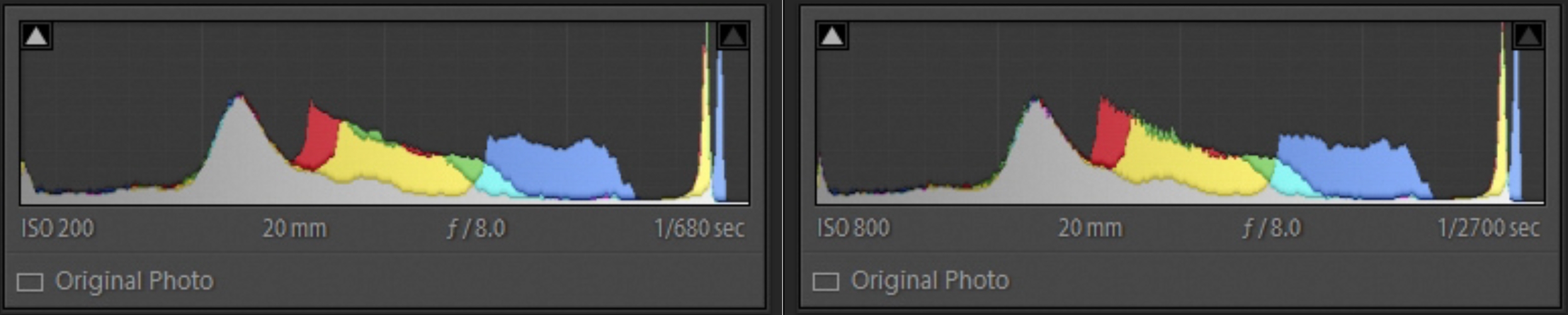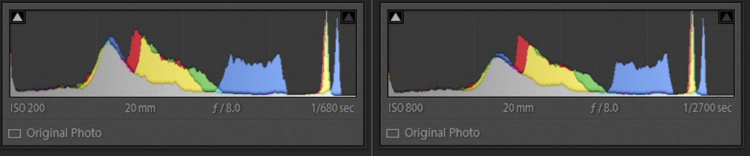 DR200 vs.DR400 RAFs in Lightroom with their nearly identical histograms.
