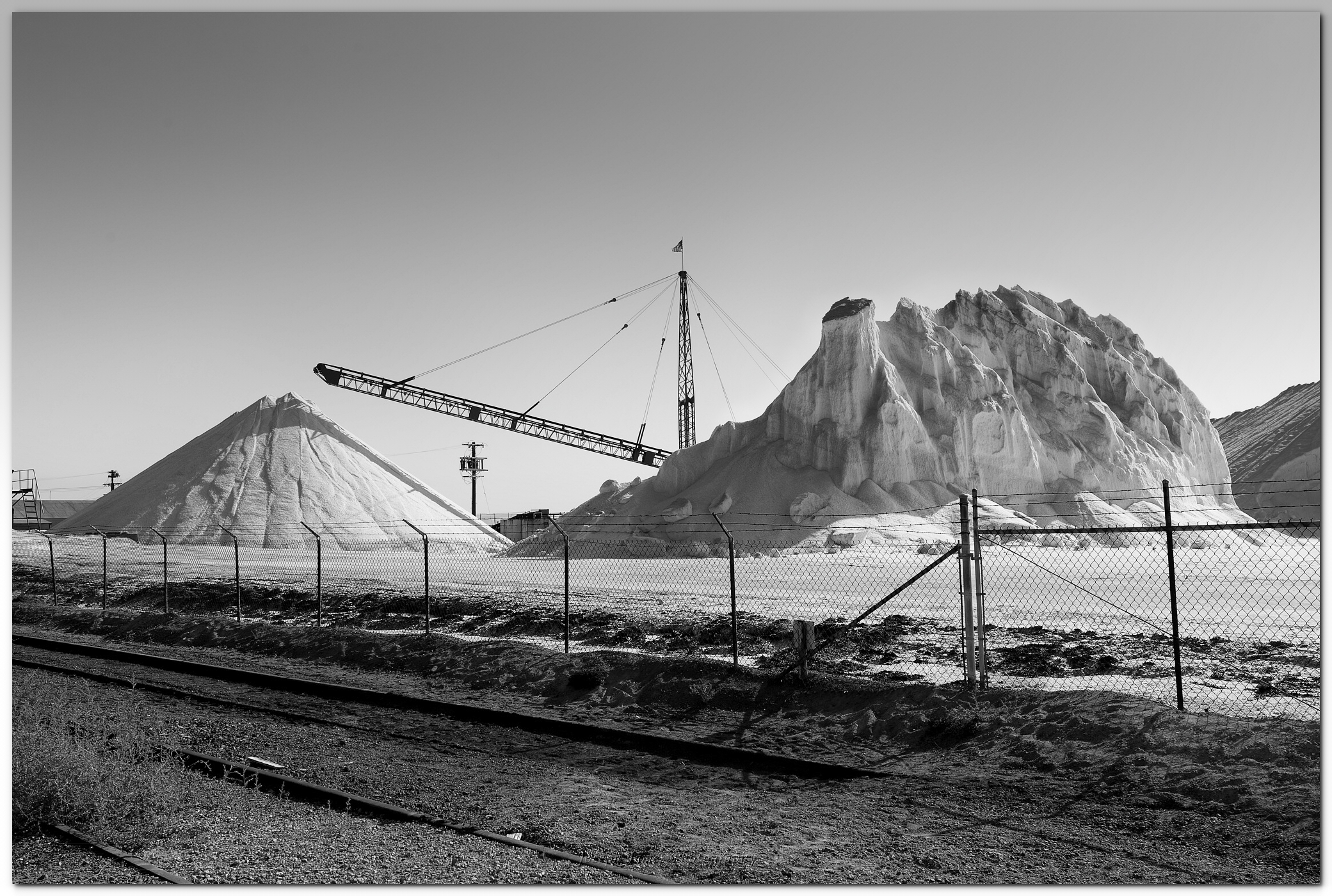 What's making the shot is the repeating nearly parallel and somewhat converging lines formed by the rails, fence and crane boom that begin with the rail in the bottom left. Then we have a series of vertical lines that also repeat and become smaller, right to left - the fence posts, the crane upright and the power lines. I'd include the shadows as well. All these elements are a similar black in all the versions and it is probably a pure black.