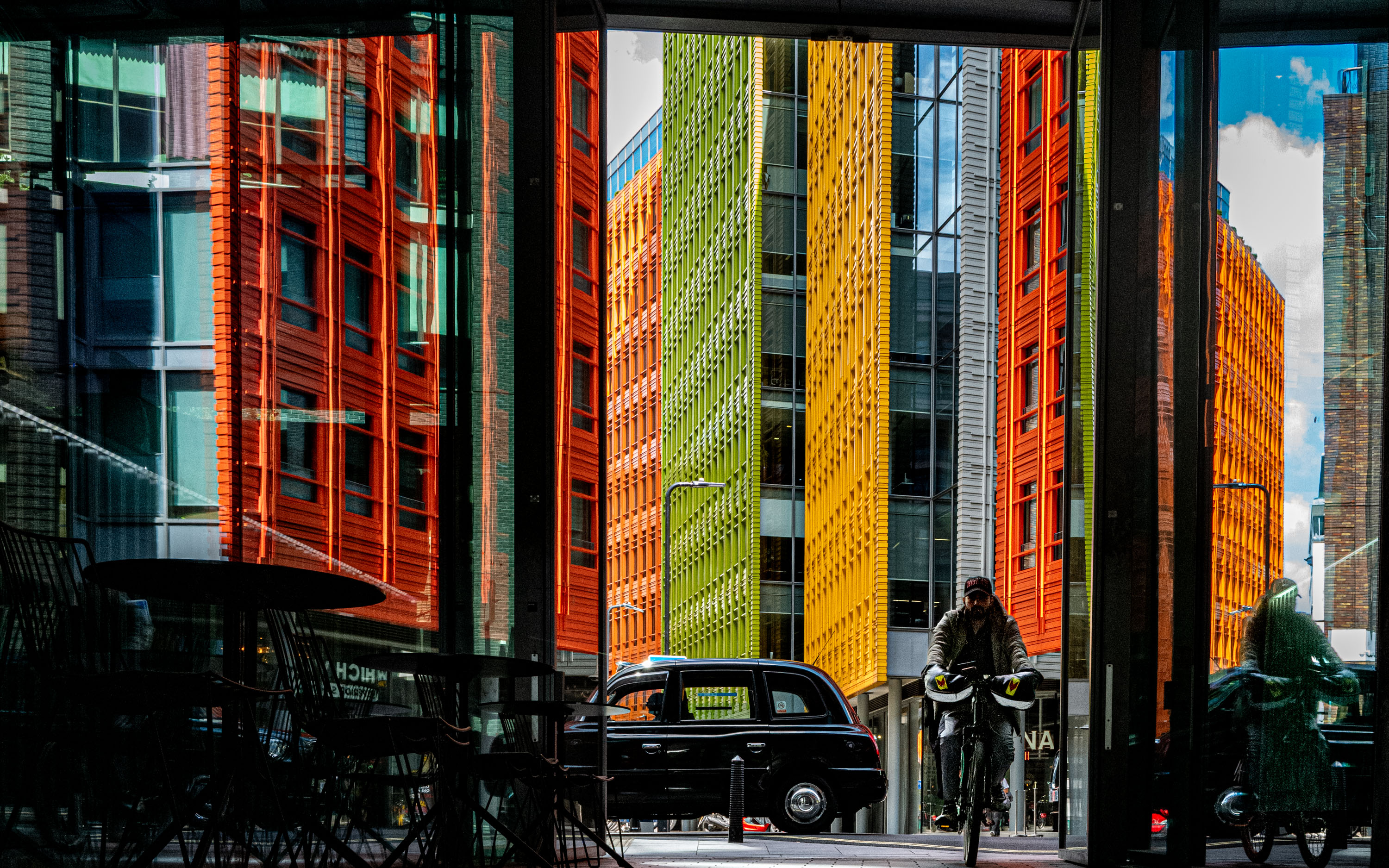 Nice picture with great colours, but I might have exposed the cyclist a little bit more as he seems to fade into the background next to the black cab.