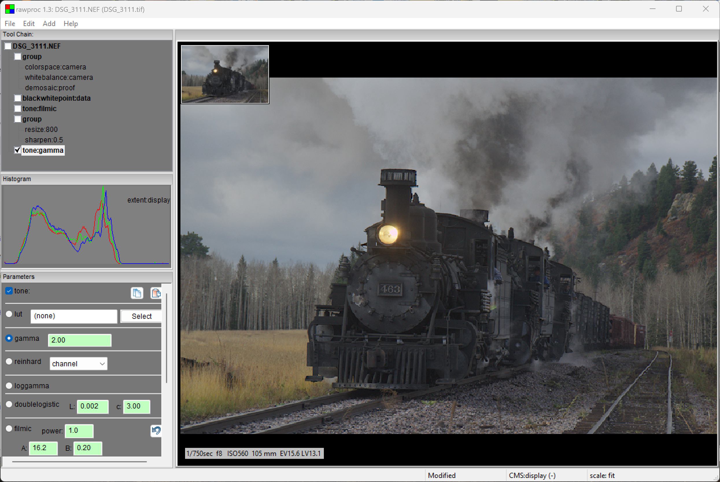 Pretty easy to follow, the processing toolchain is in the top-left pane, and the result of the checked tool is what is displayed and histogrammed. This histogram is a "linear-linear' depiction (sorry, Iliah...) , and at this point it's distribution is equivalent to the original raw data. Of particular note, the magenta blob in about the middle of the image are blown pixels (the white balance skew made them magenta), but note there's no spike or other indication of that clipping at the right hand side of the histogram.