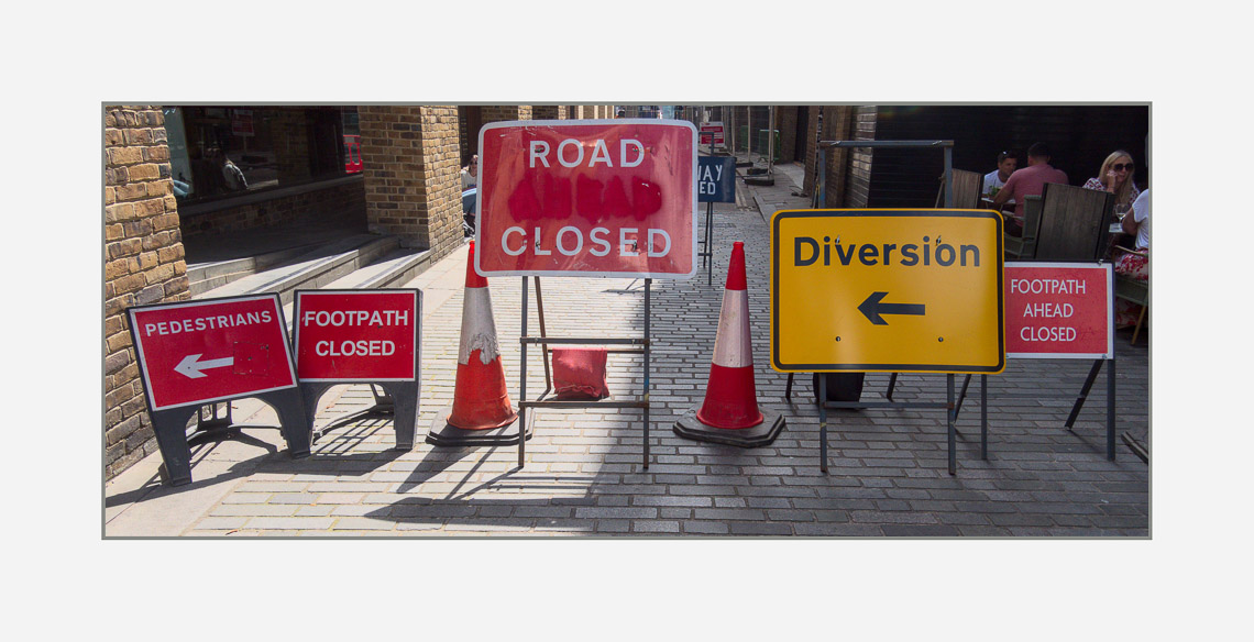 Llanthony Road Bridge over the canal at Gloucester Docks with a mix of temporary and permanent traffic signs: