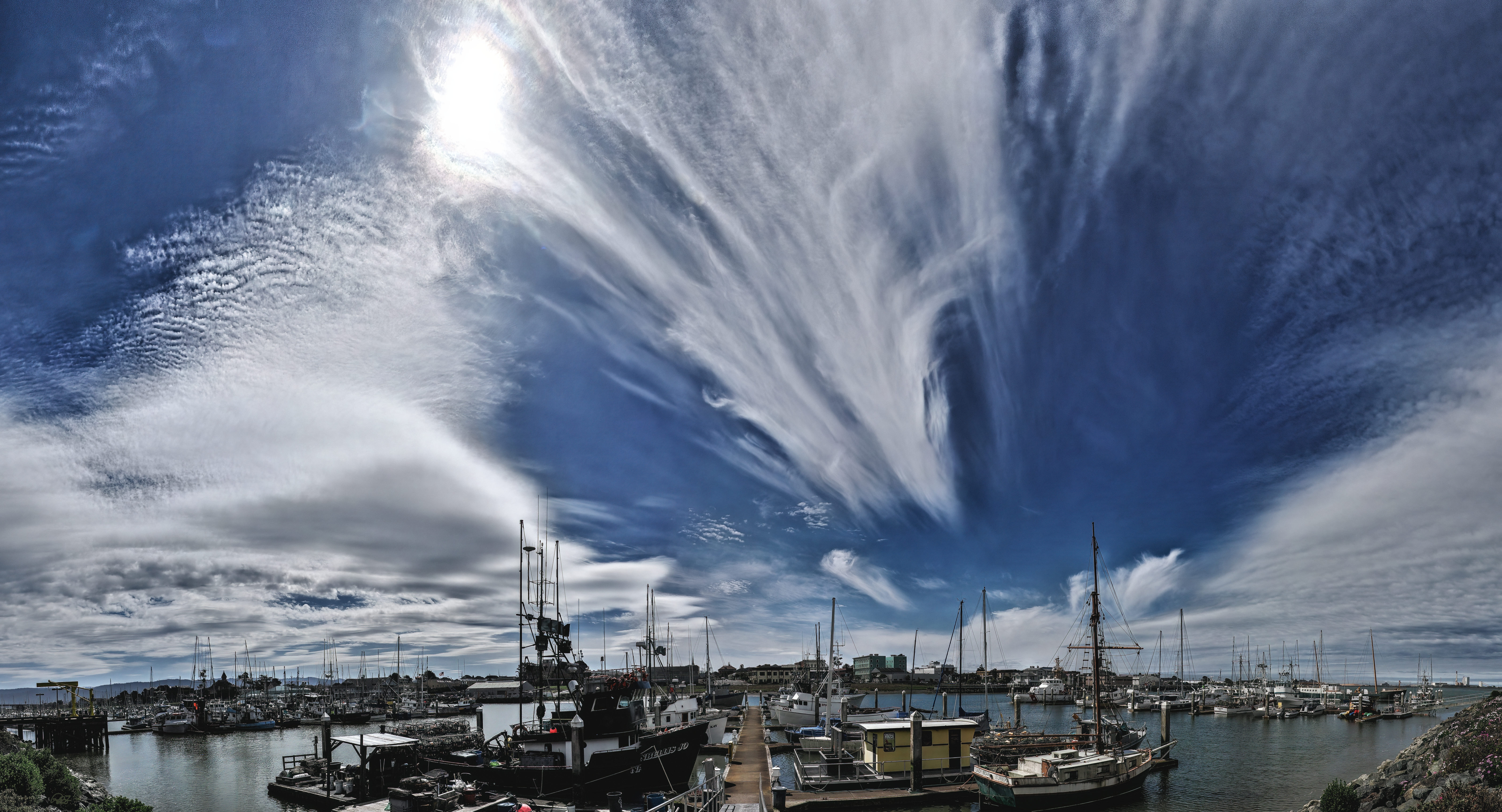 9 panel pano about a 180° pan. Woodley Island Marina looking SSW OM1 mz 12-100, 12mm