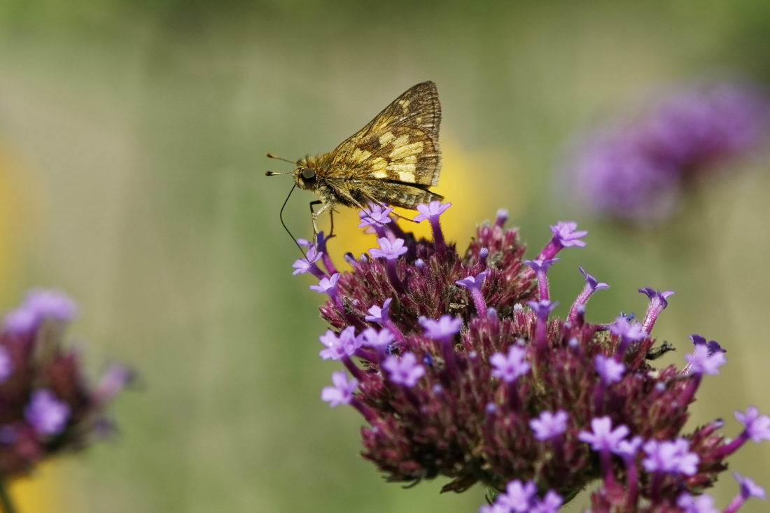 Skippers are a family of the Lepidoptera (moths and butterflies) named the Hesperiidae. Skippers are considered an intermediate form between butterflies and moths. The head and small, stout body of the adult tend to resemble those of a moth. However, when at rest, most skippers hold the first pair of wings vertically, as butterflies do.