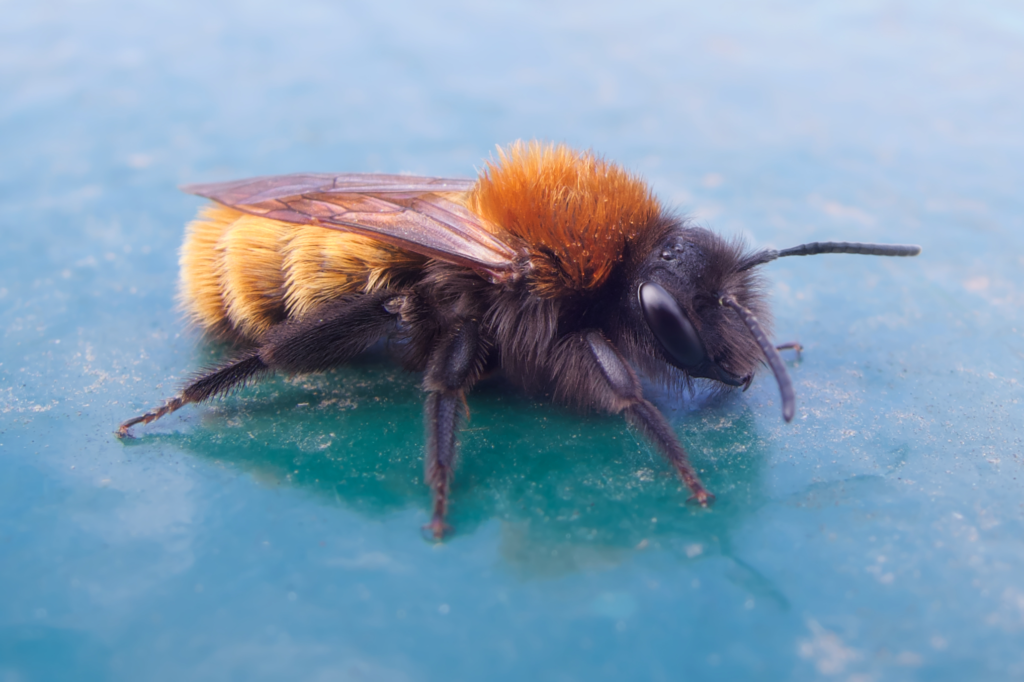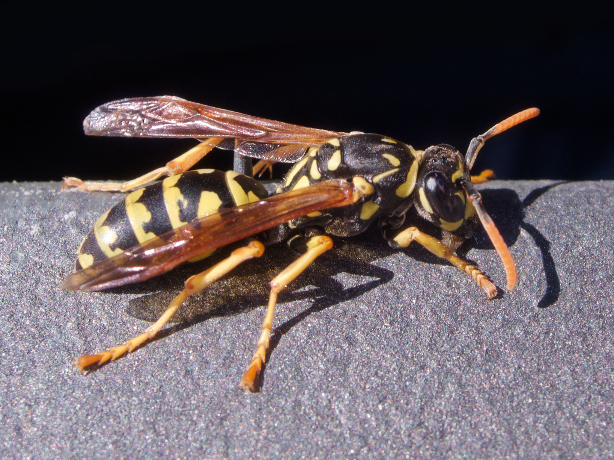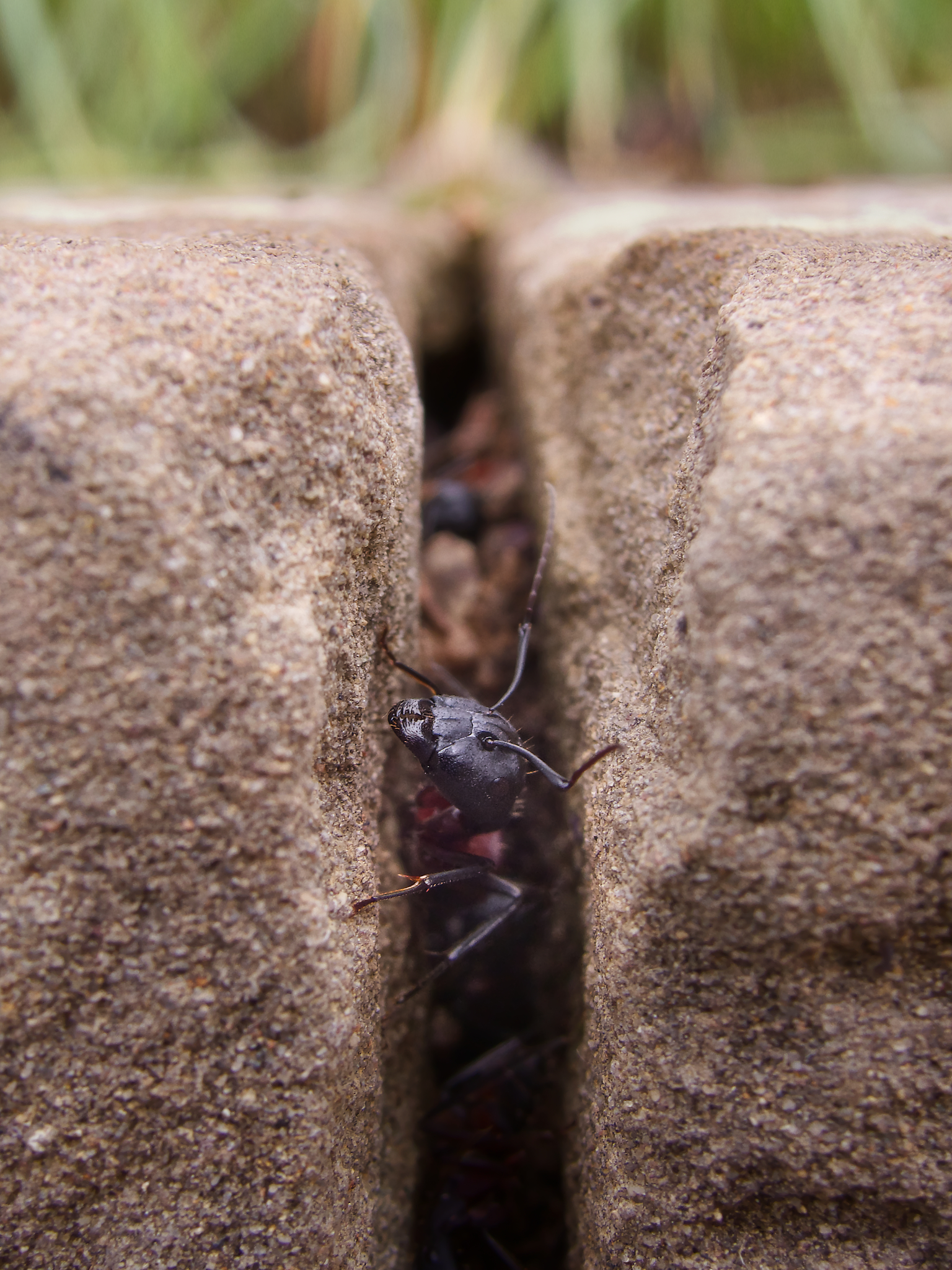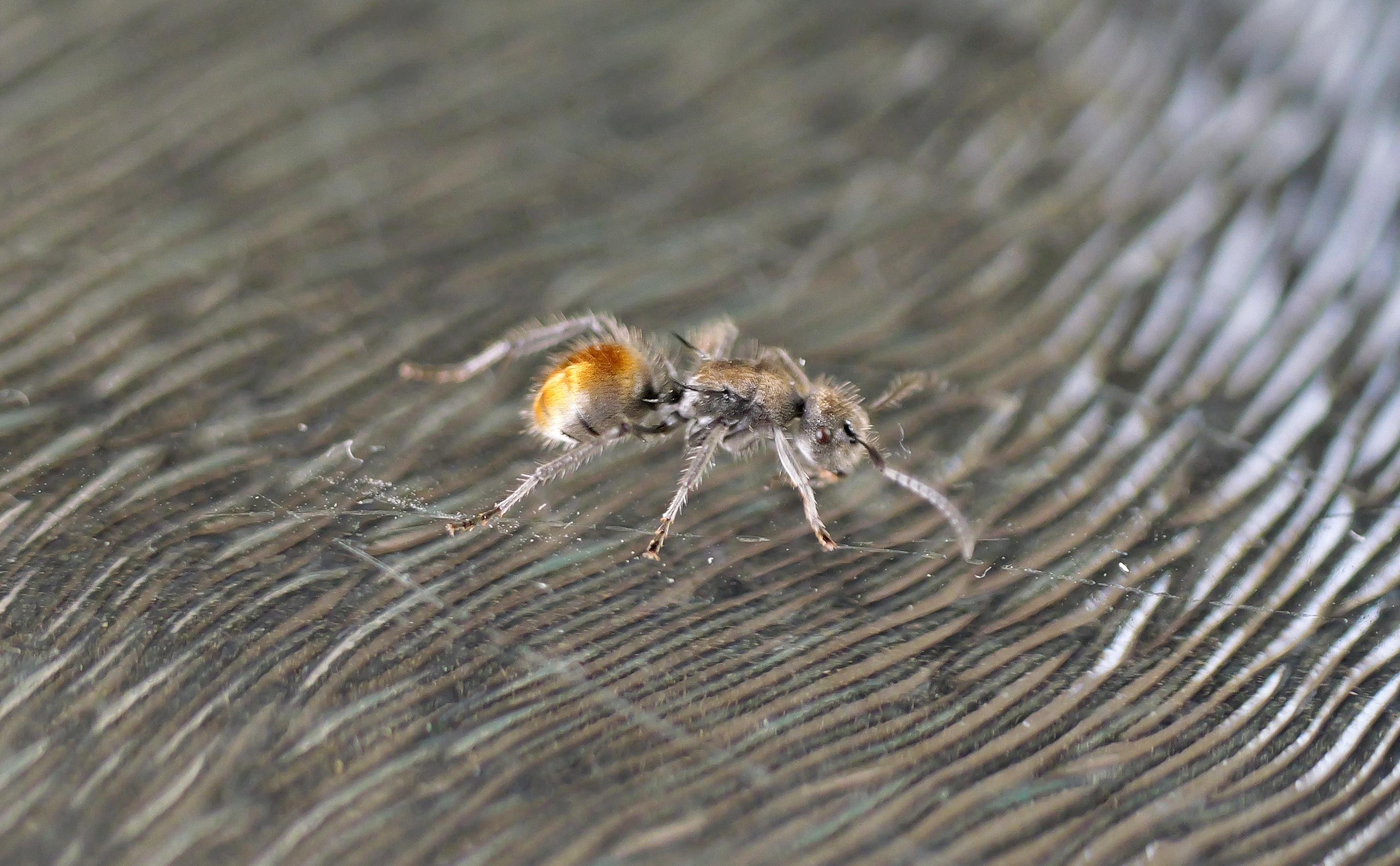 It was walking across the back of my hand so I shook it off onto the table. Then broke out my 45mm macro lens. There wasn't a lot of light so ss was low and was lucky to get this one where he must have briefly stopped walking - but his antenna is still moving... The ridges in the glass are perhaps 0.5mm spaced. The scratches are quite difficult to see with the naked eye.