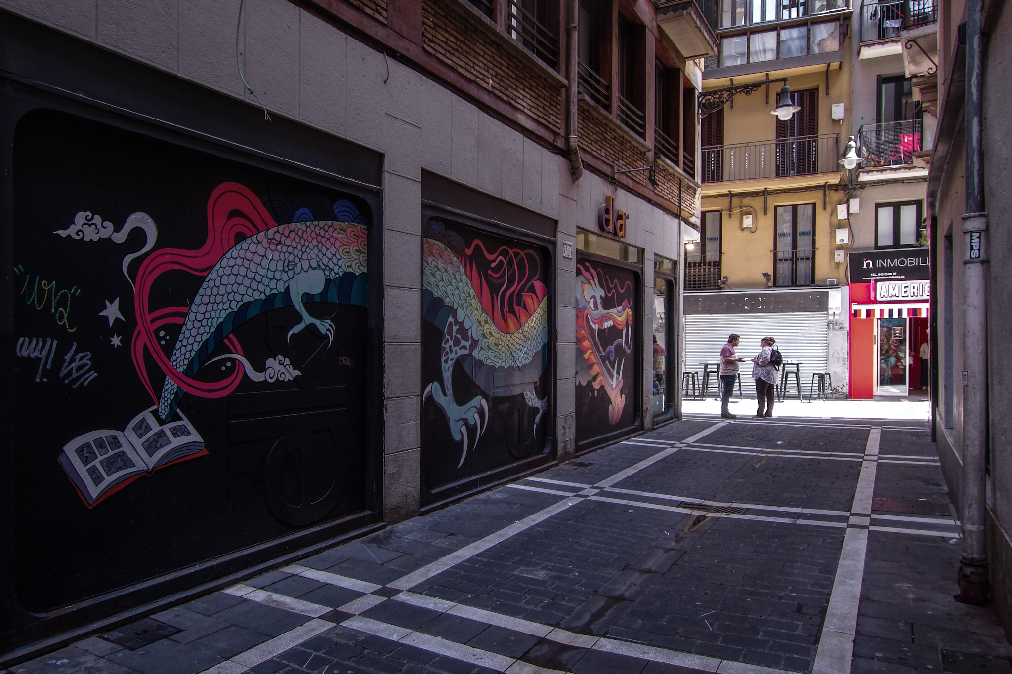 The photo is taken in Pamplona, Spain. The mural is painted in the back of a book store, and I think it was done for a comic book contest...