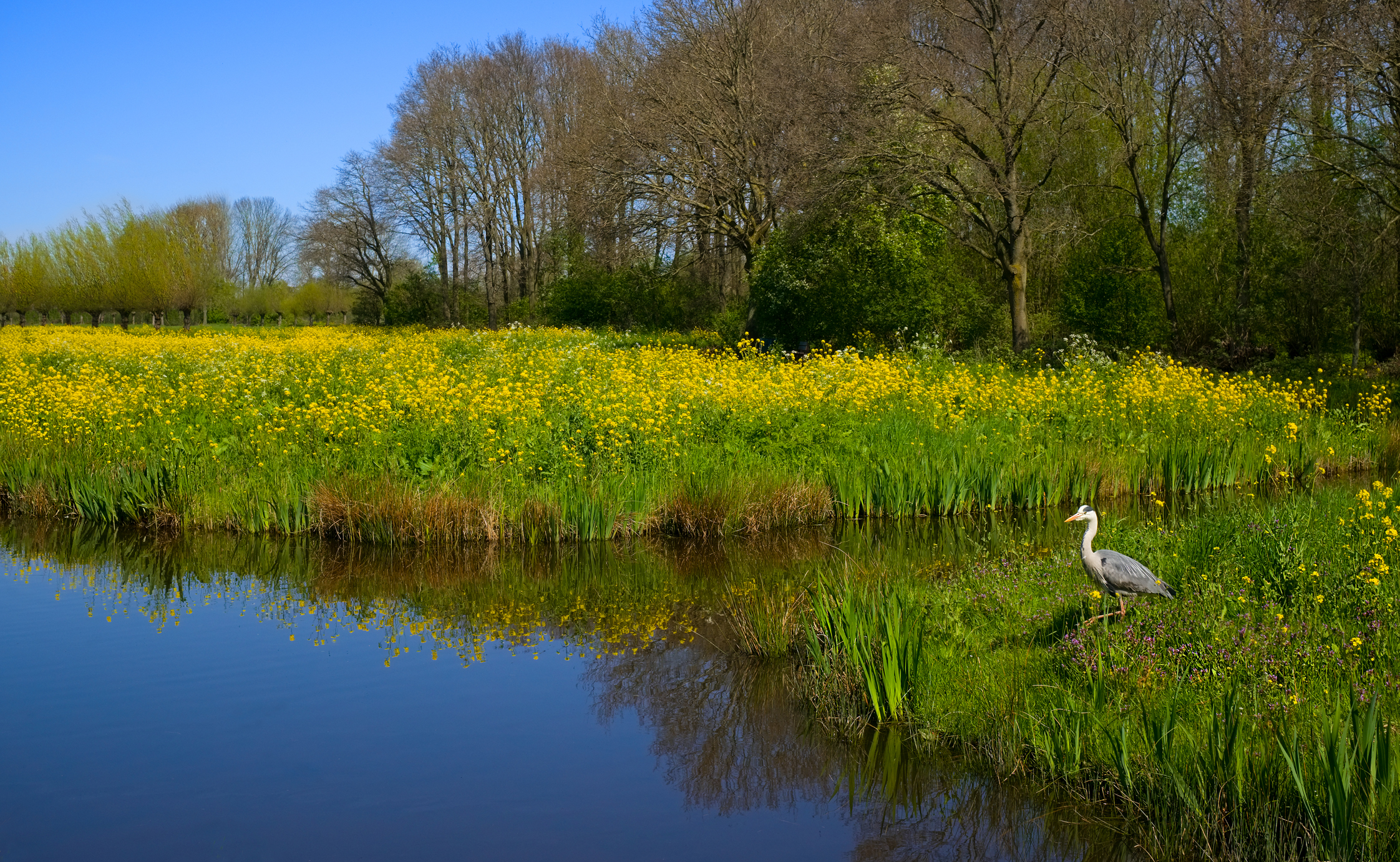 A blue heron among the yellow seed.