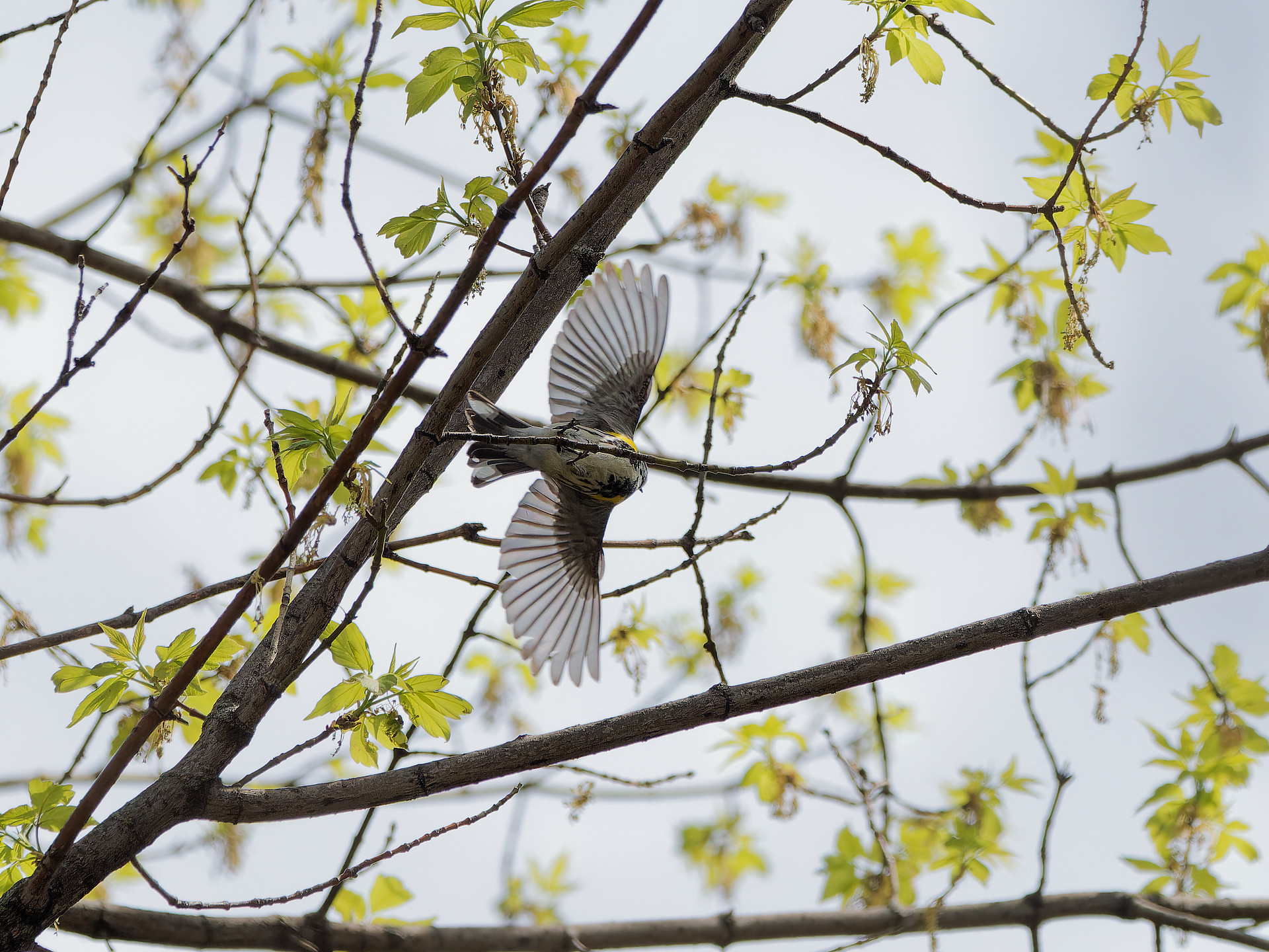 A yellow rumped warbler took off right above me. I like the view of the wings.