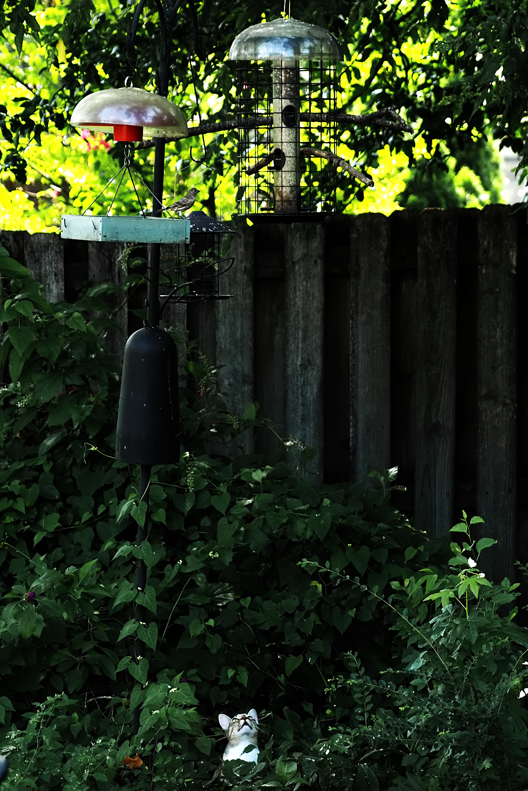 Caught in the act! Has she ever taken the leap of faith and gone straight up at the bird? (Unfortunately) mine have done that and caught their prey. Sometimes I can distract them enough to let the bird go but sometimes not before the bird is harmed. In this case I guess the camera was an effective deterrent. :)