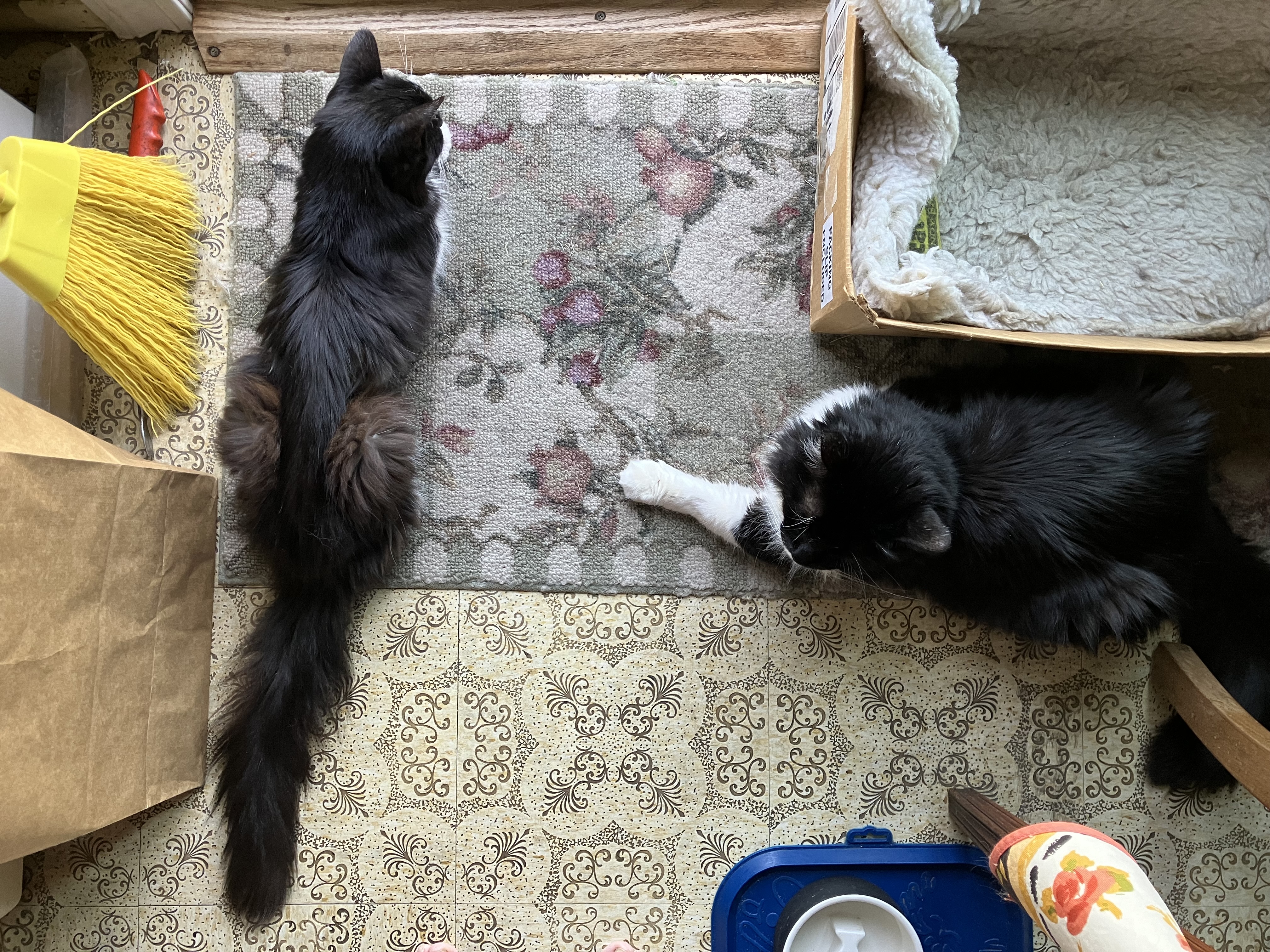 Since last week was so quiet, I thought I'd echo it with this reminder of one less purr in my house. Maybe a bit somber start for the week, but as happens, the hole when we lose a kitty takes a while to close. Palmer left, Mini-Me right.