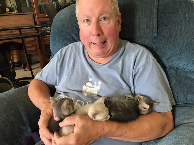 Yep. That's Sammy, all right. All three are siblings, but it didn't look that way at first. We know, of course, since they came from under the same farmhouse porch. And none of them look like mom, who is black and white. No one ever saw dad, of course.