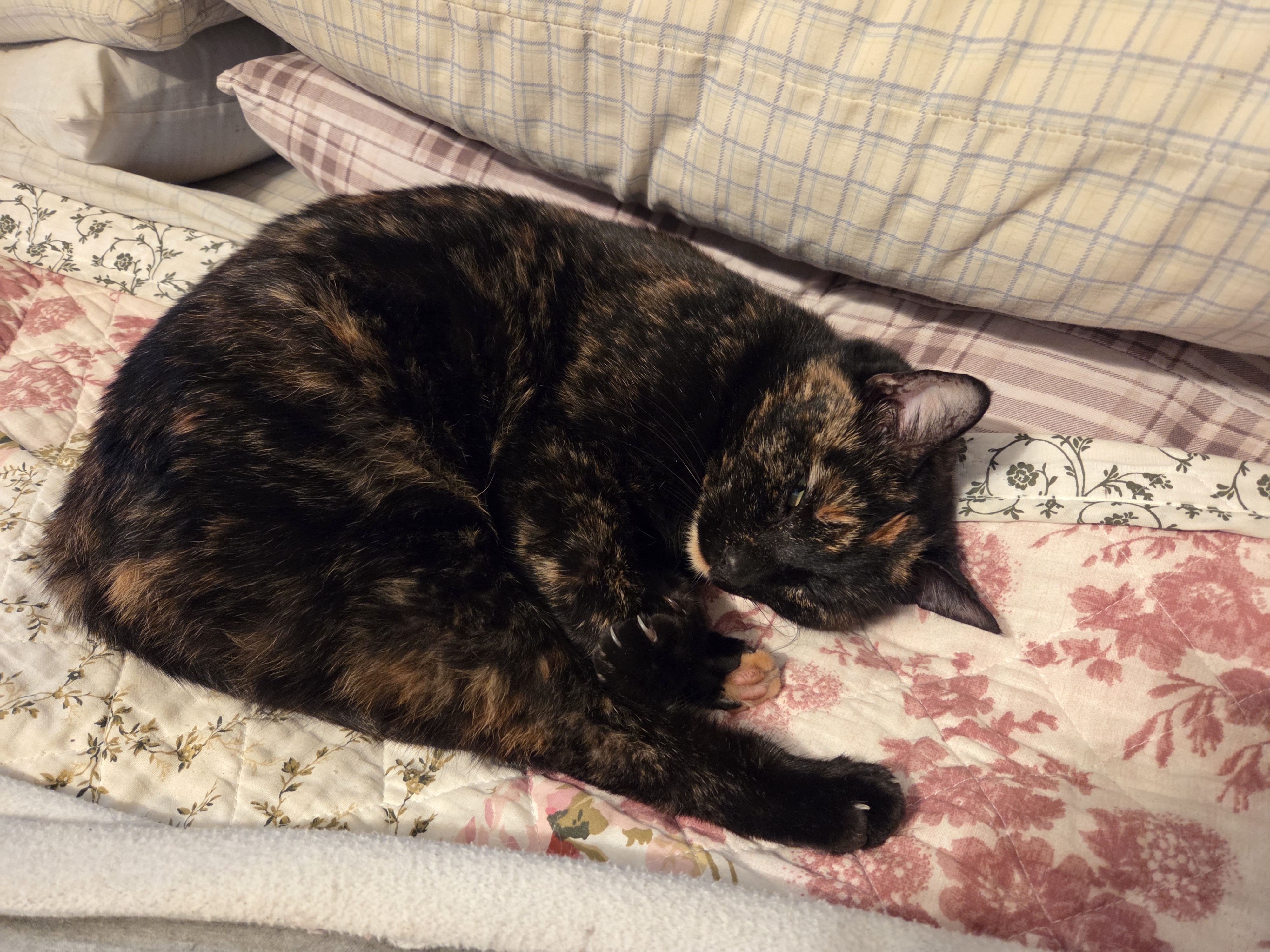 So we figured out that on the days we don't see her, she is over there. And the days they don't see her she is over here. And she has been getting to the point where she is here more than there. And today is a rainy day and rather chilly. And here she is in our bed. Warm and dry and sleeping nicely.