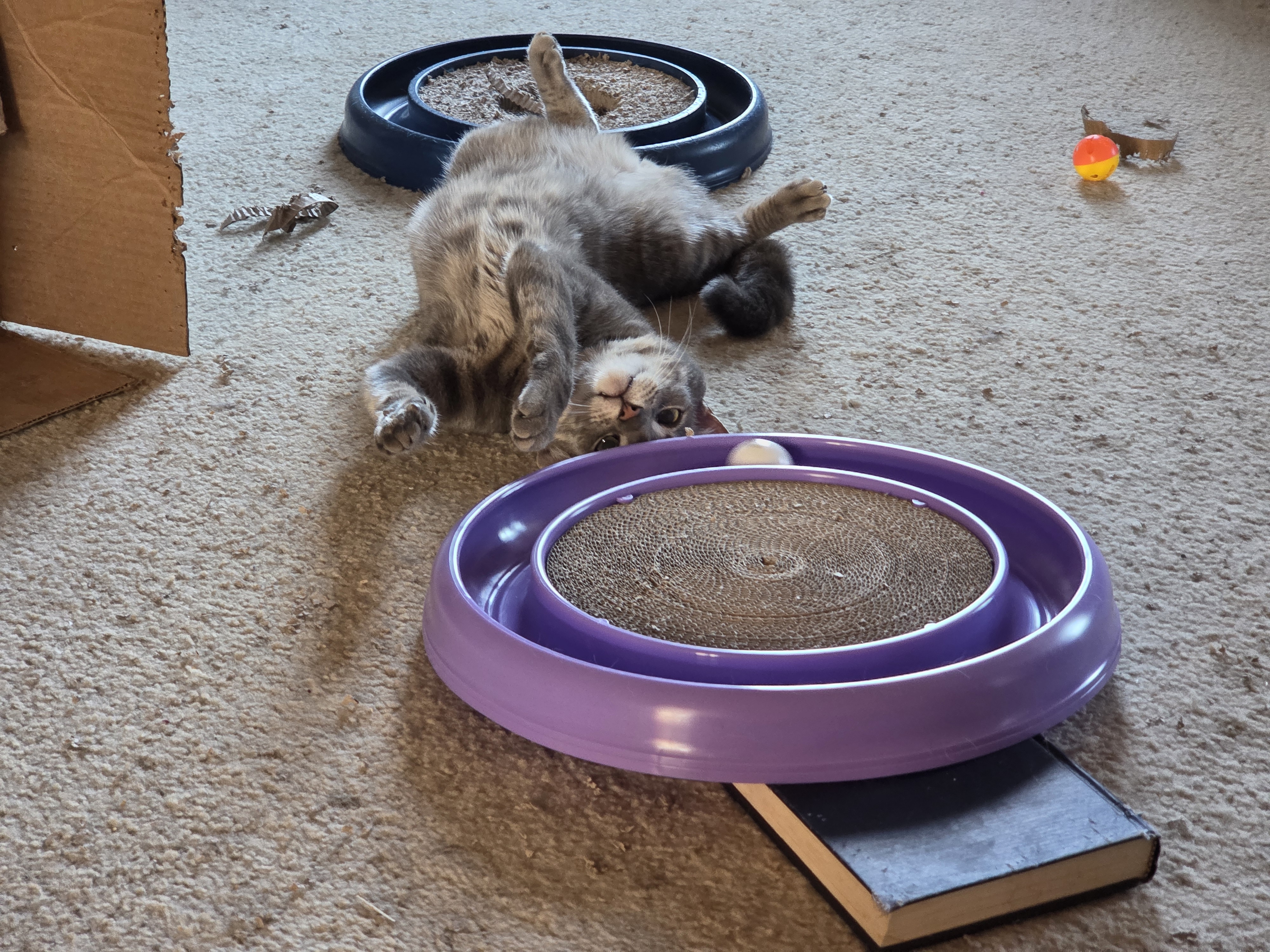 Here is Jack lazy playing with the new ball track. Yep. A new one. Because the ball is now missing from the old one. It'll turn up eventually and then they will have two.