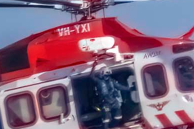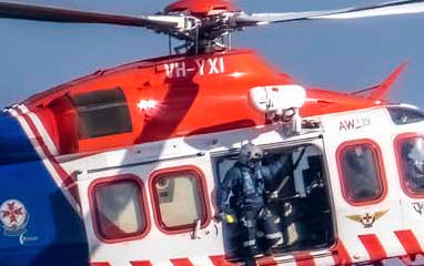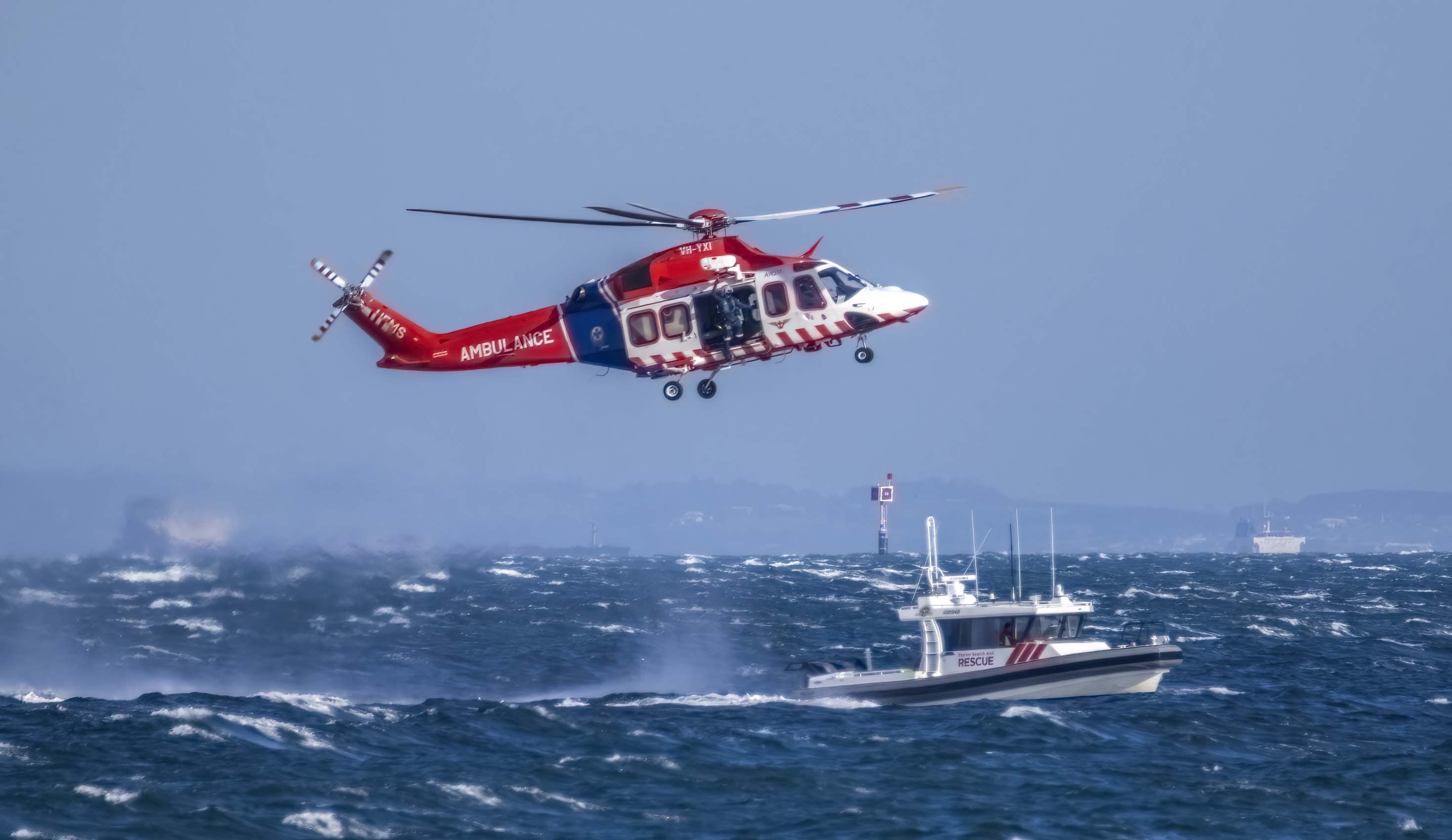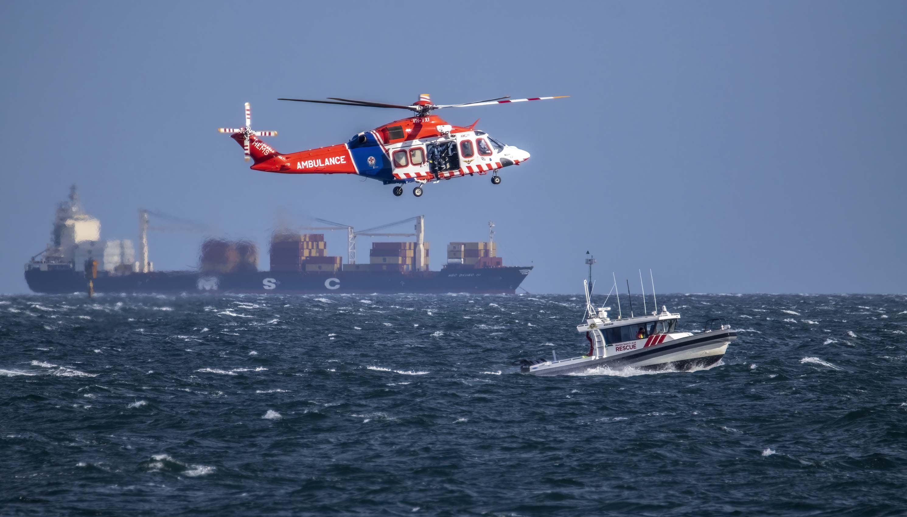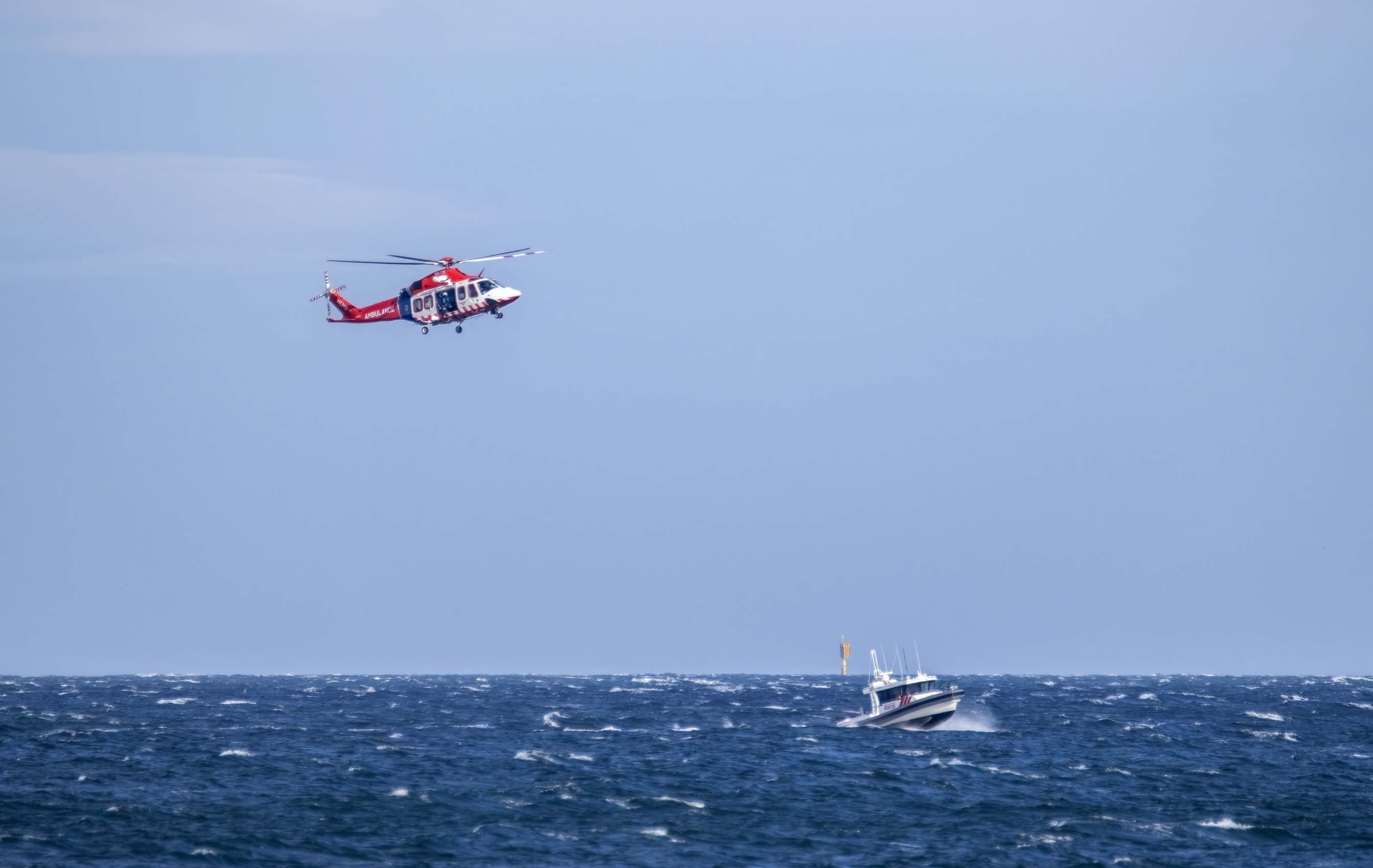 The wind was howling, the wind surfers were out and about and so was the Marine Search and Rescue boat with Ambulance helicopter following behind.