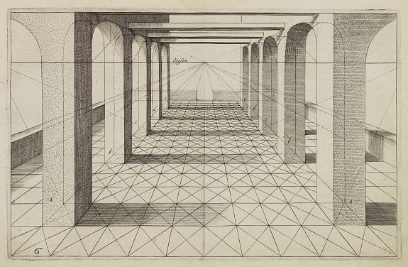I rather like the following diagram from Jacopo Barozzi da Vignola (1583) in which a drawing or painting is imagined as transparent and the lines of sight are shown in more detail. When viewed from the centre of perspective, every point in the 2D image lines up exactly with the corresponding point on the 3D object. The position of the viewer's eye is critical.