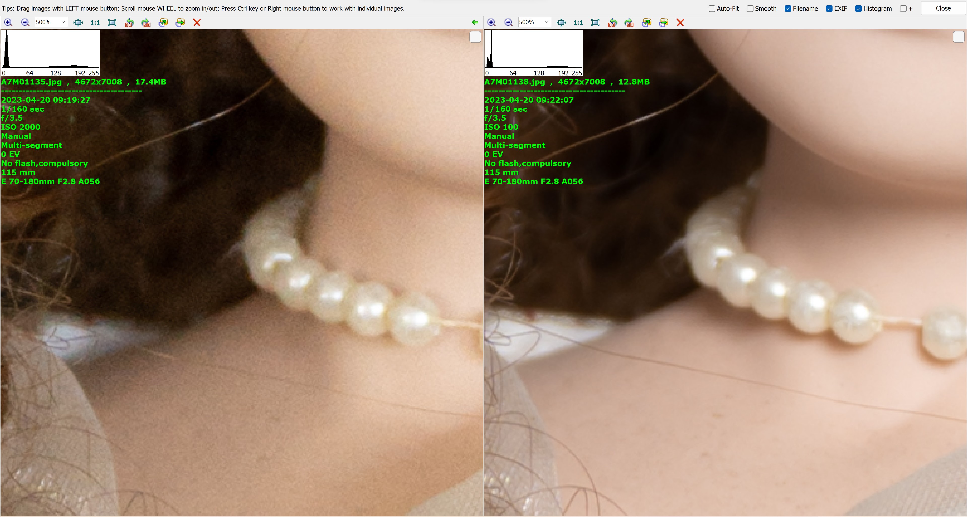 I could show pics at iso 100 without noise and pics at 6400 with noise.