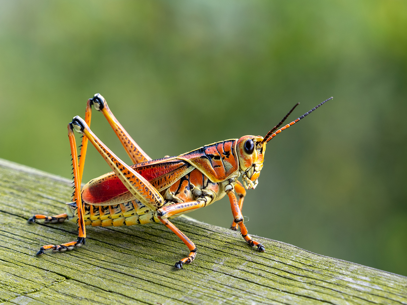 Be carefull :The large, brightly colored Eastern lubber grasshopper is hard to miss. Its bright orange, yellow and red colors are a warning to predators that it contains toxins that will make it sick. But the colors are a spectacular sight for people just watching the slow moving, large grasshopper displaying its hues.