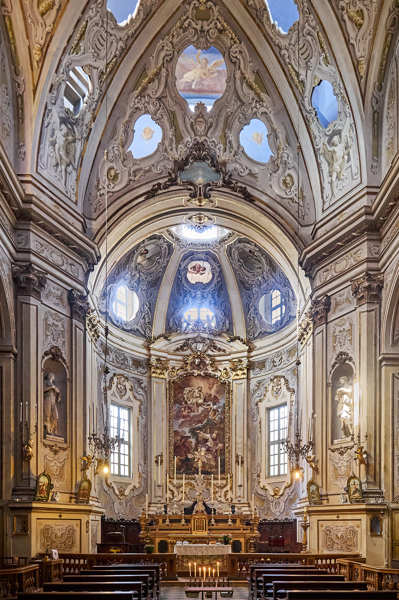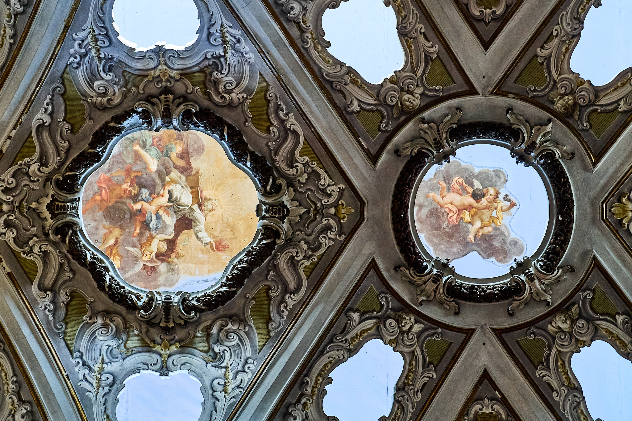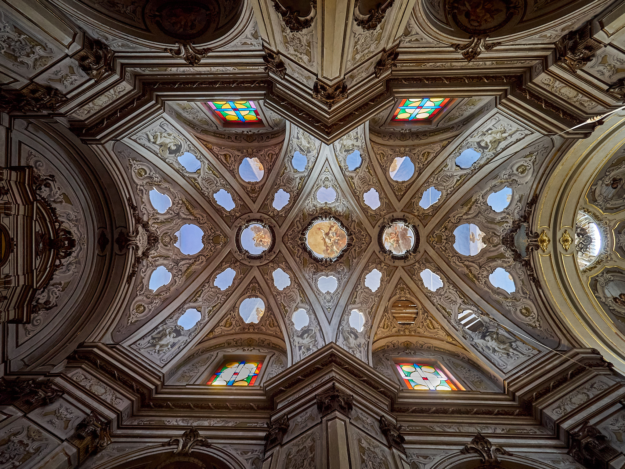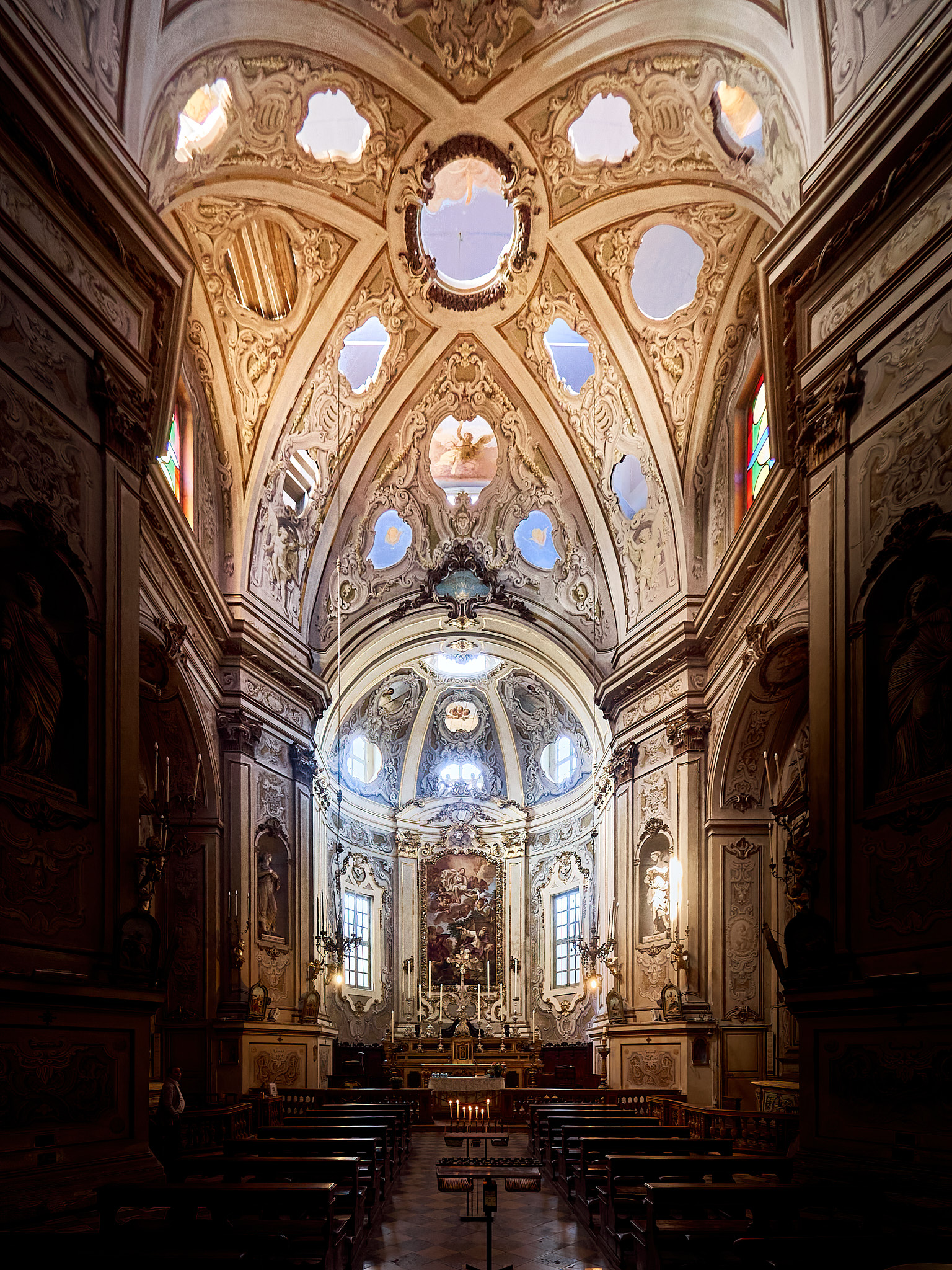 This church in Parma is/was? off limits for photography, but, I managed to convince the verger to turn a blind eye back in 2019. This church has a double ceiling, the lower one having holes, though which we can see angels and things against a blue sky. Normally this would be a candidate for tripod/ monopod HDR with FF, but I did what I could very quickly with my EM5 and the 7-14.