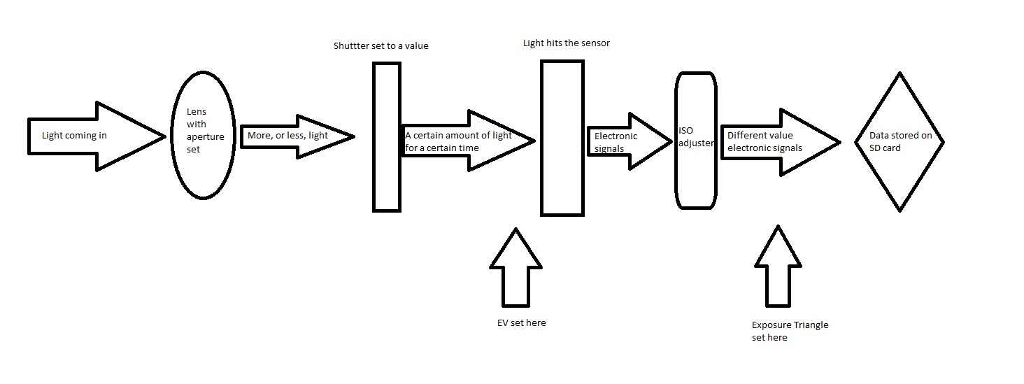 3. It's meant to show that the "exposure triangle" concept takes place before the data is stored on the SD card - so ISO does have an effect on the end result - bit not on the light itself.