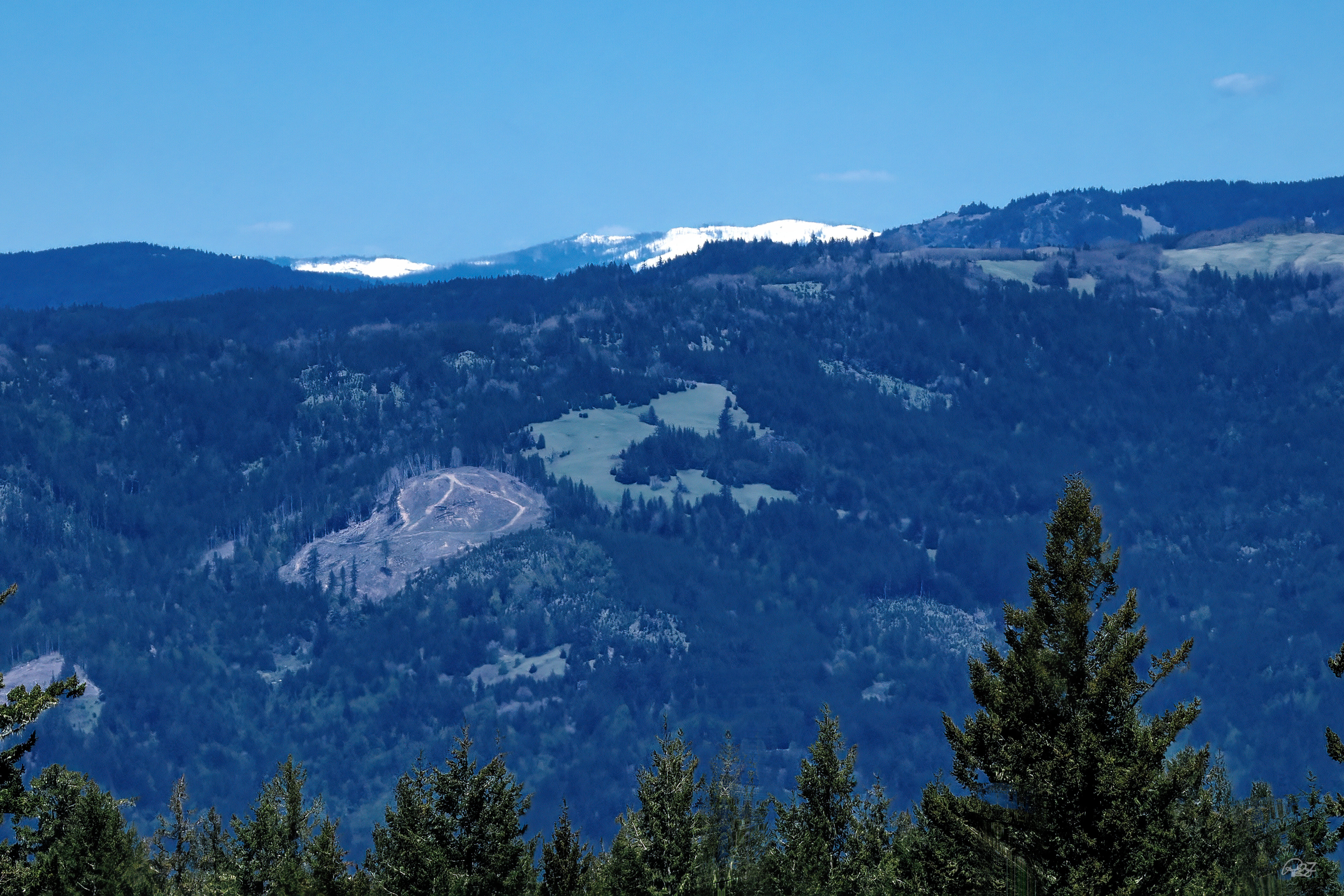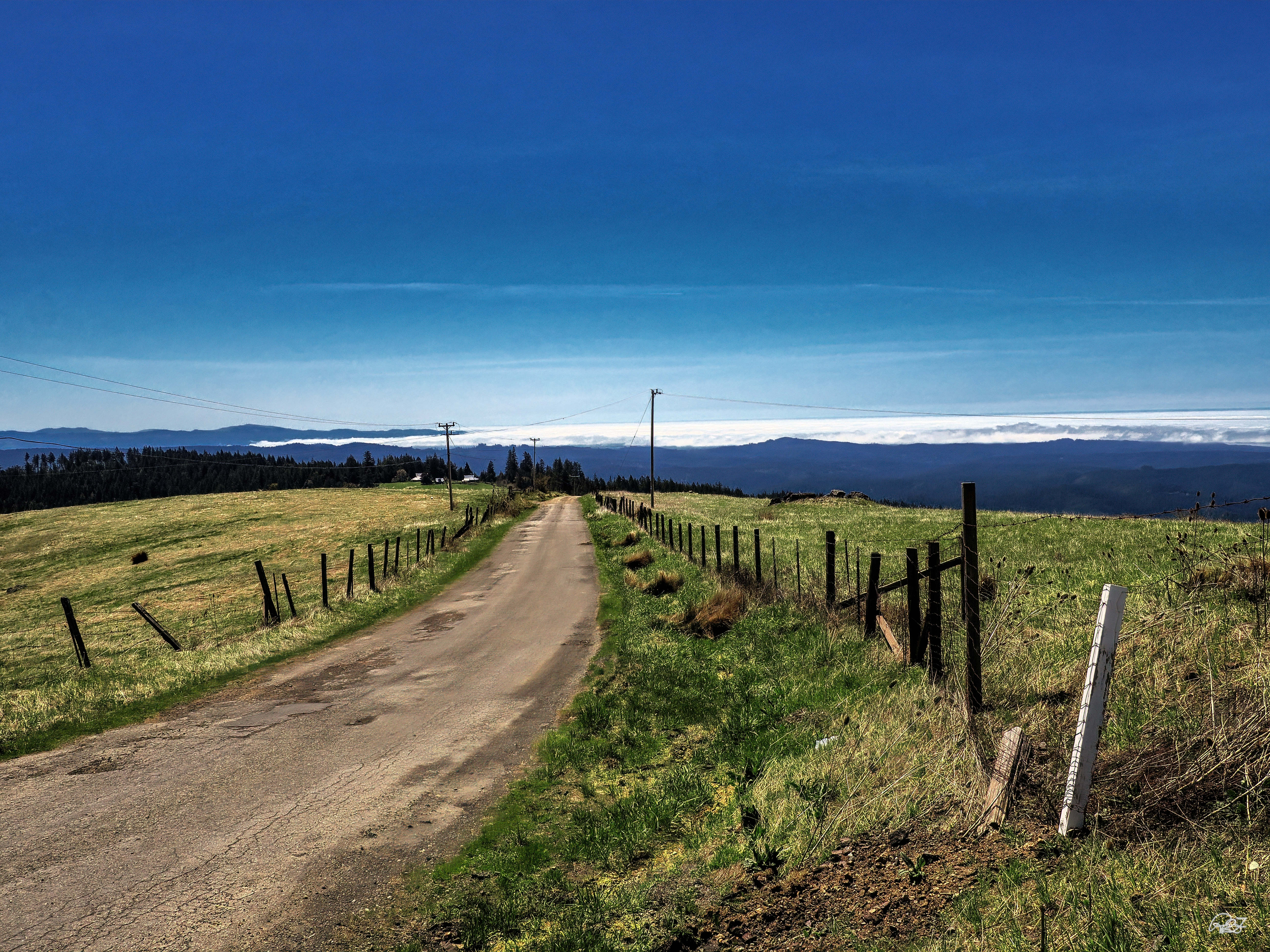 I decided to fight the fog by driving up on the 3,000 feet elevation mountain ridge just behind Humboldt Bay. The road leaves Eureka at sea level and climbs up to 3,000 feet elevation in about 17 miles. It's very steep and curvaceous and fun to drive, second gear in the turns and third gear on the straights. The Kia handles and brakes very nicely and I have stickier new Michelins than before. The blood drains from my brain down into my right foot and my now shrunken brain sloshes around inside my skull through the turns. This about half way up at a break in the forest where you can look west and see parts of Humboldt Bay and the surrounding pastures as the fog recedes. I'm already well above the fog.