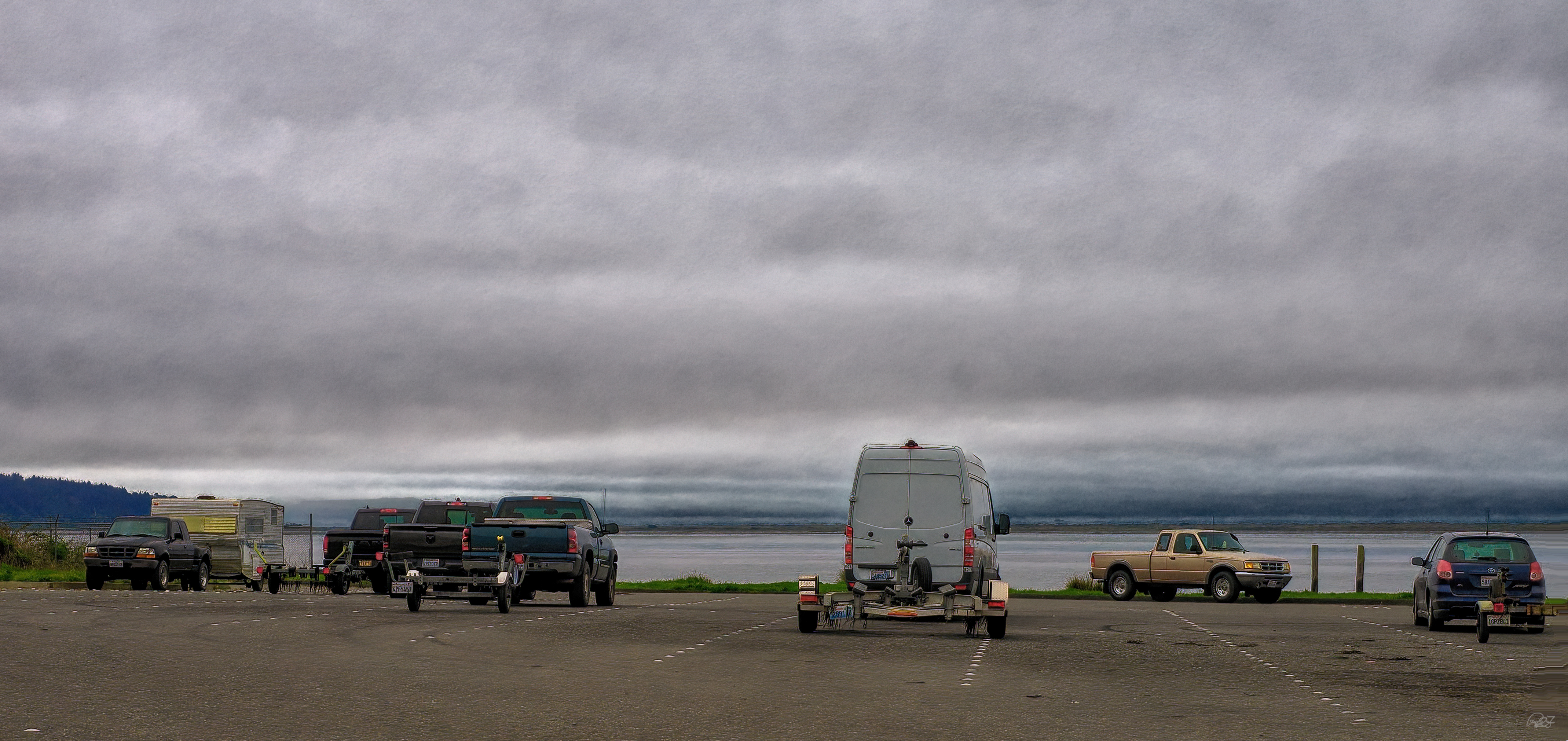 I imagine this sky looks like home to Dave. All the trailers mean it's fog-fishing time. That's much better than ice-fishing because it ain't cold. Even the Toyota Matrix at right is hooked up to a trailer. It's rubber band CV transmission won't like that.
