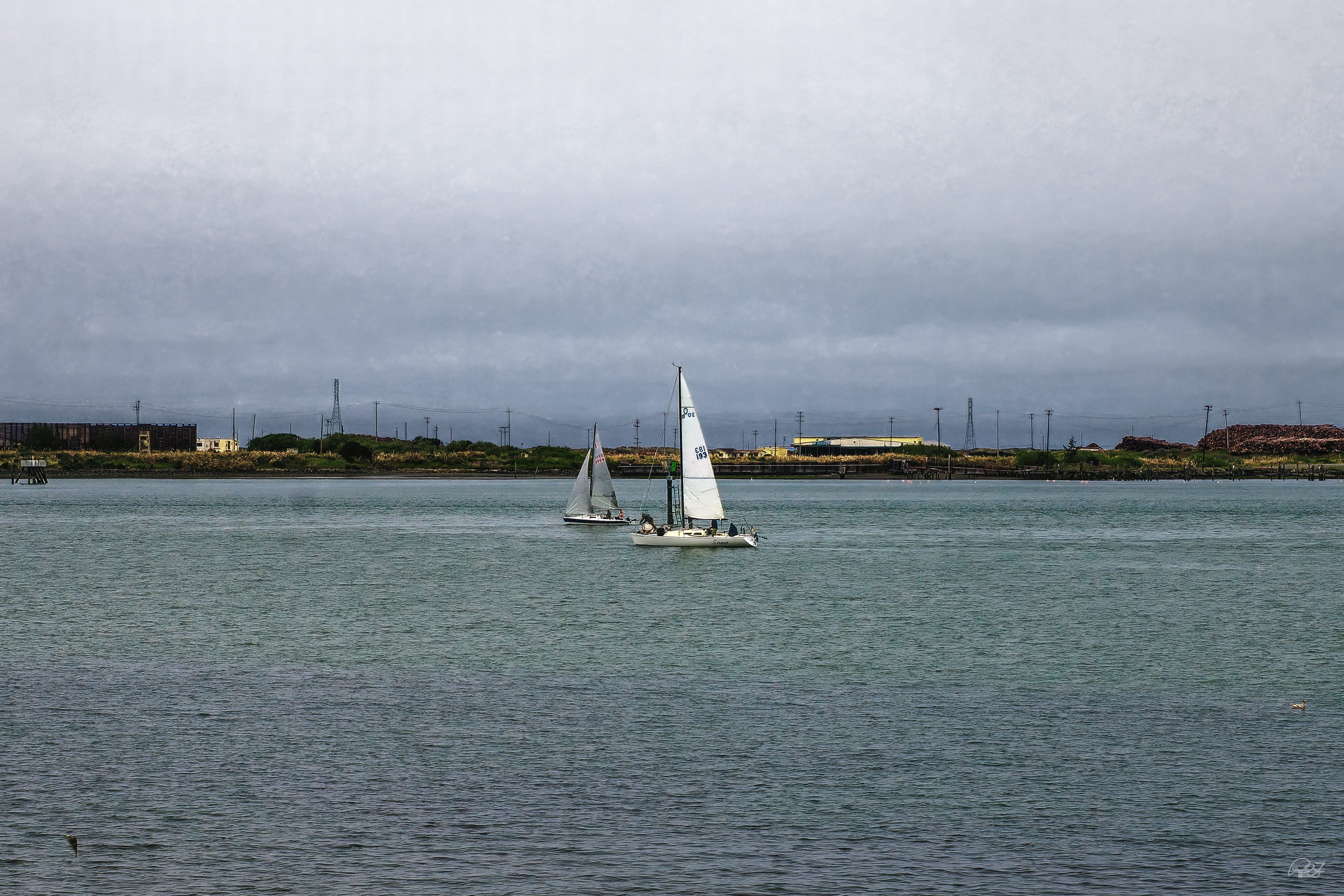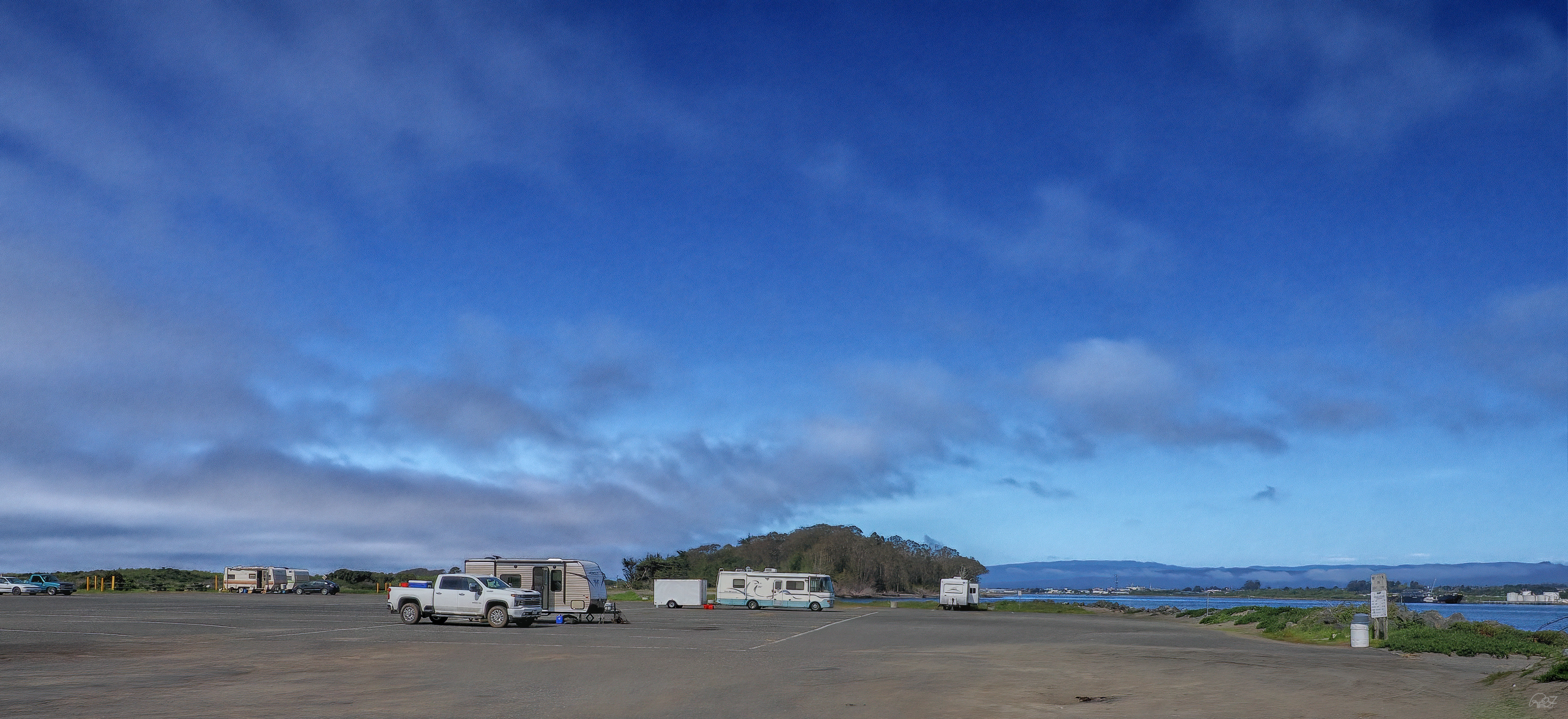 Back down at the beach where I started, on The Samoa Peninsula, Humboldt Bay side looking north. The fog is waiting patiently over The Pacific on the left. This is a popular spot for tourists with large recreational vehicles. Just the smart off season tourists now. In a few weeks it will be jammed with motor homes and trailers in those marked spaces, packed in like kippers in a tin.