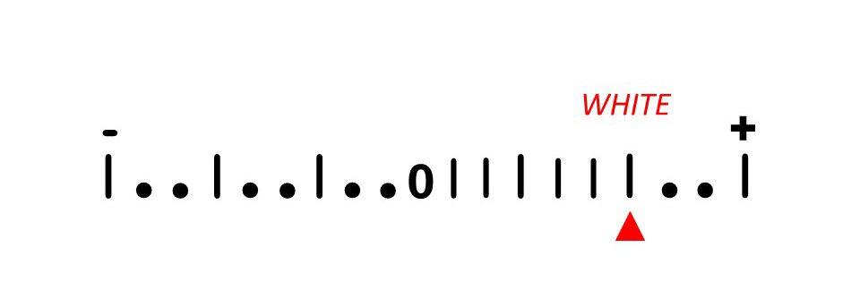 A meter reading of about +2 stops from 0 indicates a predicted lightness matching that of white. For instance, if you were to photograph a snow-covered field in manual mode, a meter reading of +2 would accurately represent the lightness of that wintry scene.