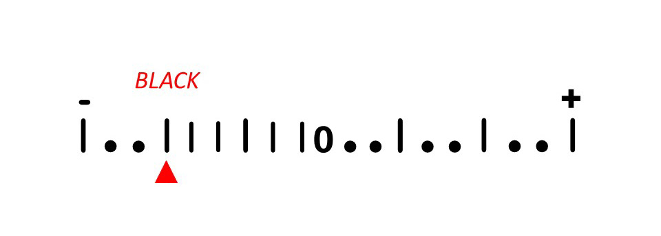 A meter reading of about -2 stops from 0 indicates a predicted lightness matching that of black. If making a night sky photo from a remote location in manual mode, the in-camera meter will probably read well below 0. That's OK. A pristine night sky is pretty dark.