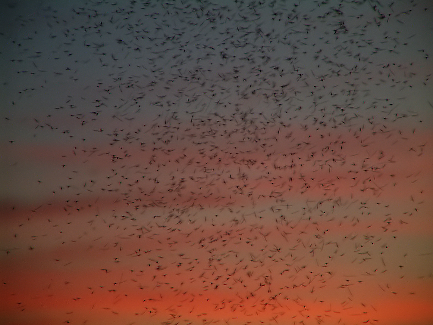 It turned out to be gnats that were flying around my backyard. I took some more photos of the blank sky at another location at f/16 and could barely see one faint speck of dust.