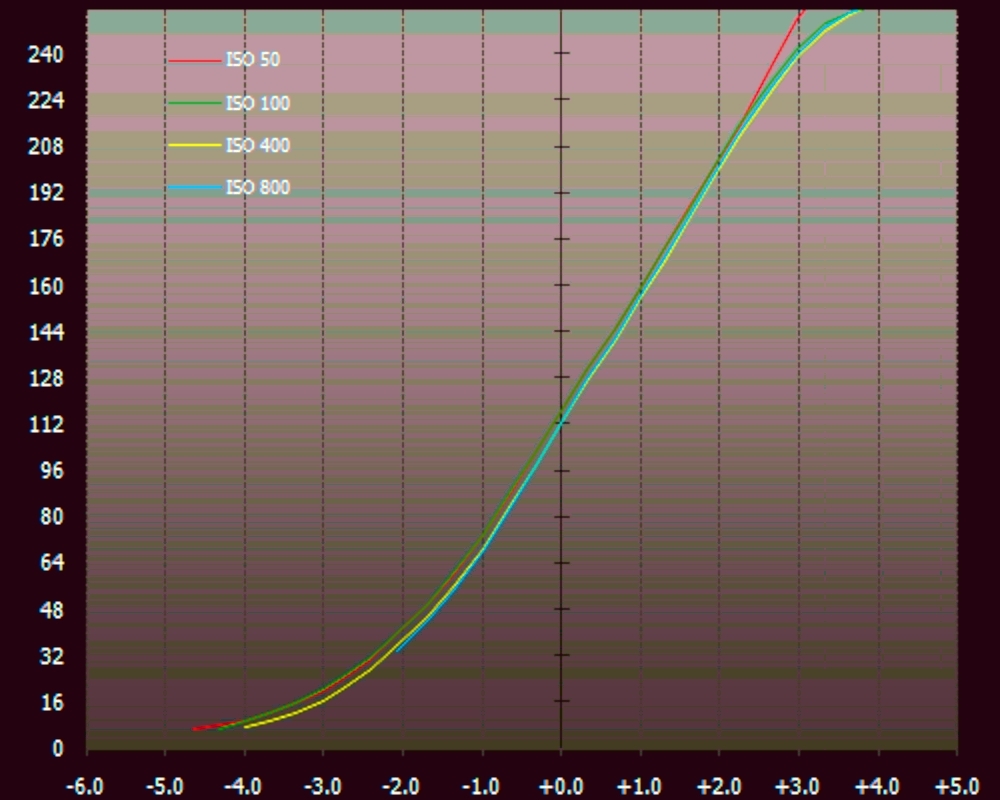 The 'S' shaped curve does reduce contrast** at low and high illuminances. One camera I had actually tested with a straight line at 50 ISO going up to 255 sRGB (see above). Good for clouds, eh?