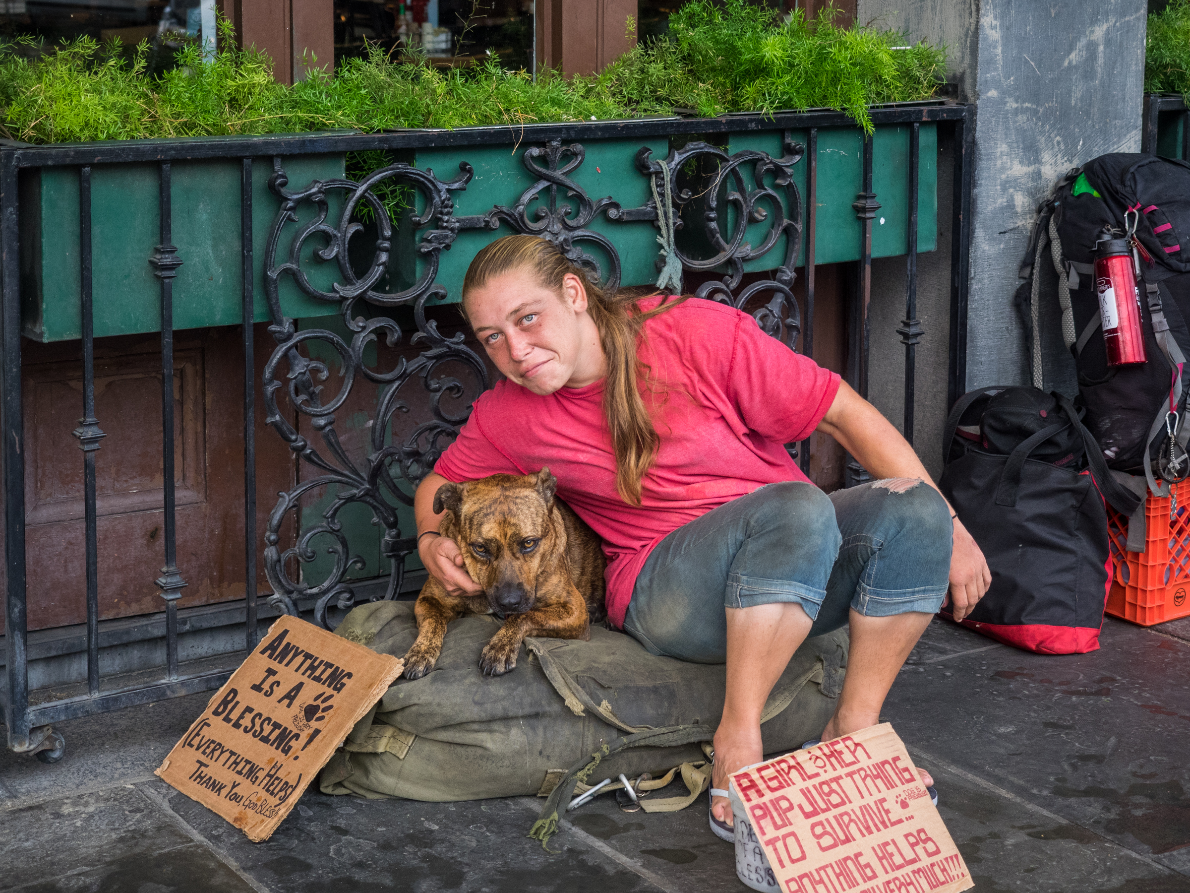 Hope (not her real name) and her dog Isis (she stresses that the dog is named for the Egyptian goddess, not for the terrorist group) live on the streets of New Orleans, and drift in and out of the French Quarter between certain corners. She arranged her space, her dog and herself in the pose and background of her choice. When I was in New Orleans more regularly, I formed relationships with some of the people I met in the Quarter - the street performers, the musicians, the homeless, the artists - and when I got a good photo of them I took them a print.