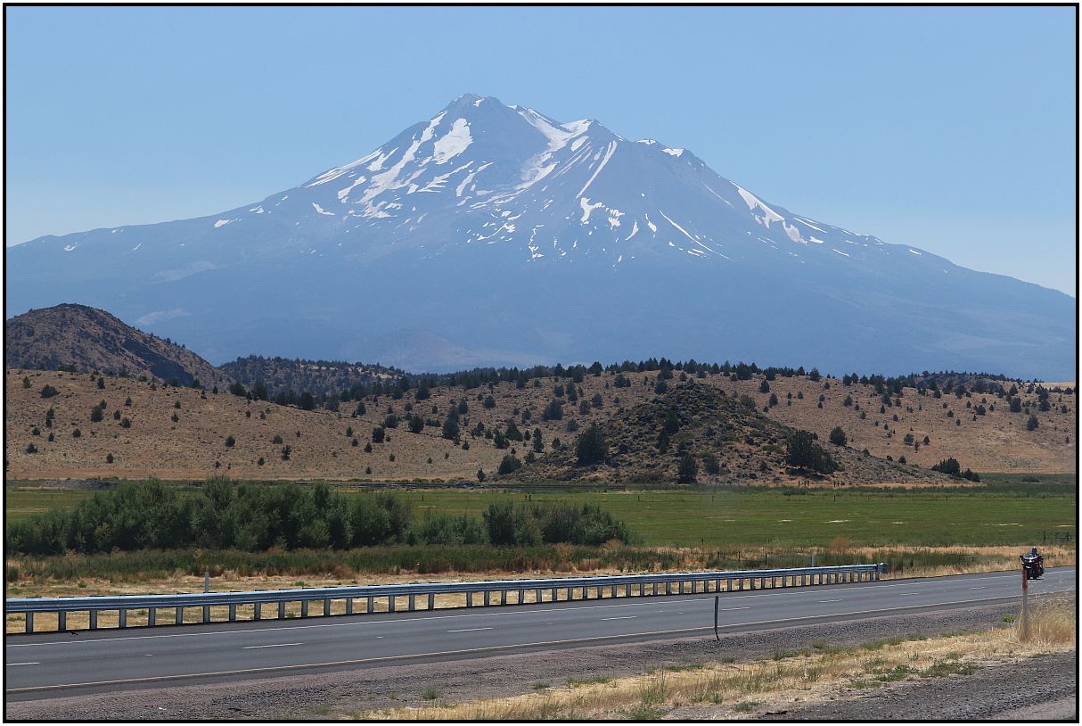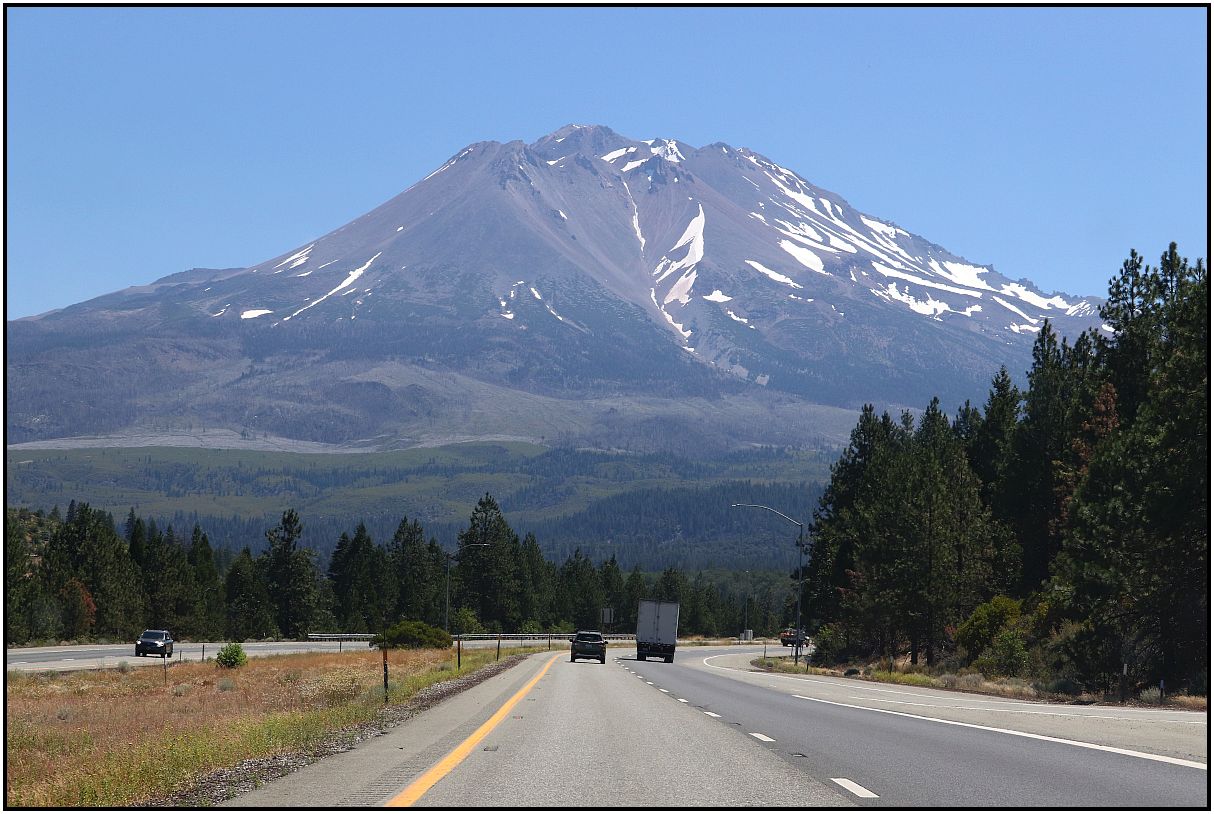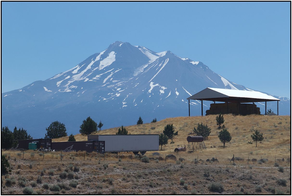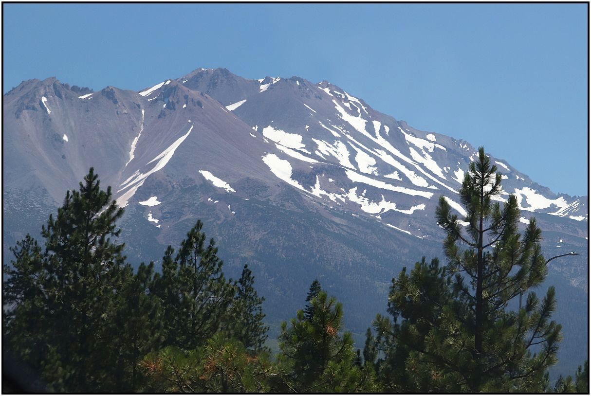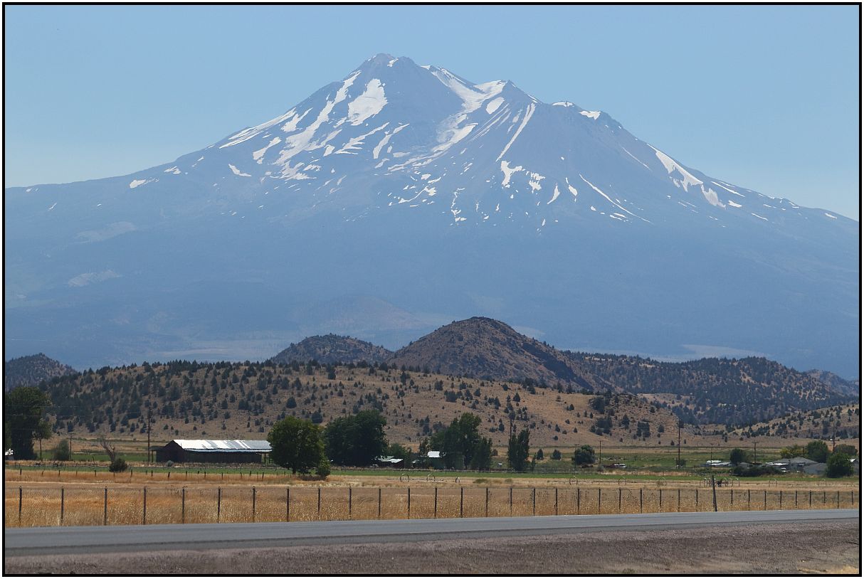 Last year I also showed pictures of Mt. Shasta, from a moving car. I'd also like to show some again from our trip to Northern California. It's a prominent volcanic peak that is much taller than the surrounding mountains. It also happens to be close to the interstate highway too. There was a little wildfire smoke, so the mountain was not crystal clear, but OK enough to show some photos. Coming home a little over a week later although, the smoke intensified and there was cloud cover. So these taken at the beginning of the trip were much better. Most of them were taken through car glass too.
