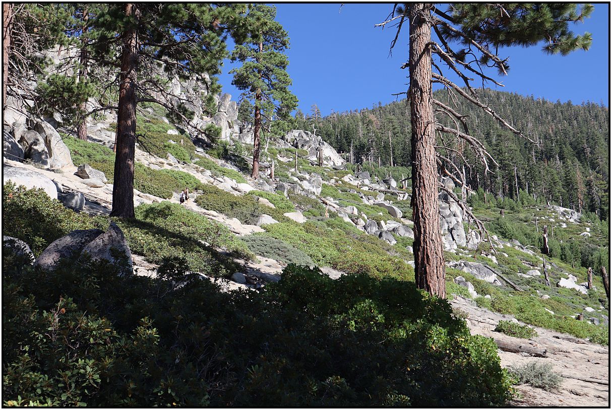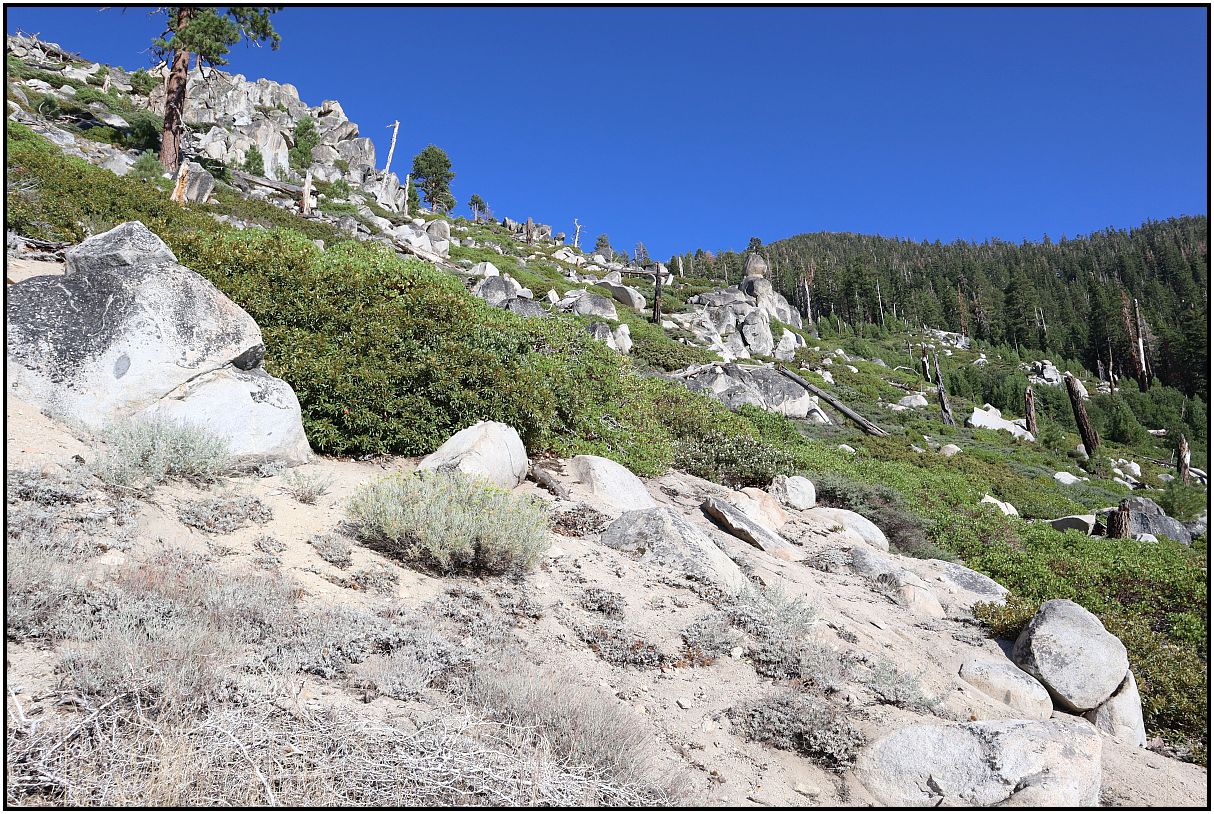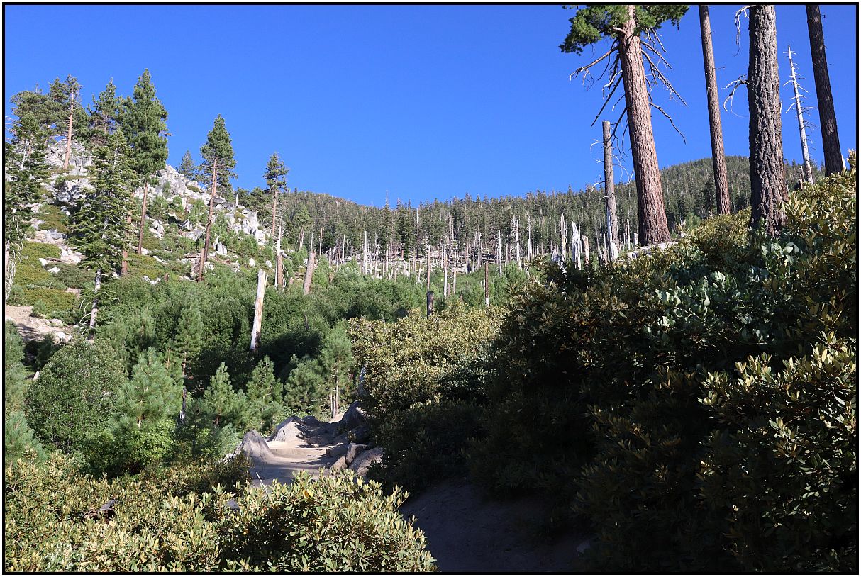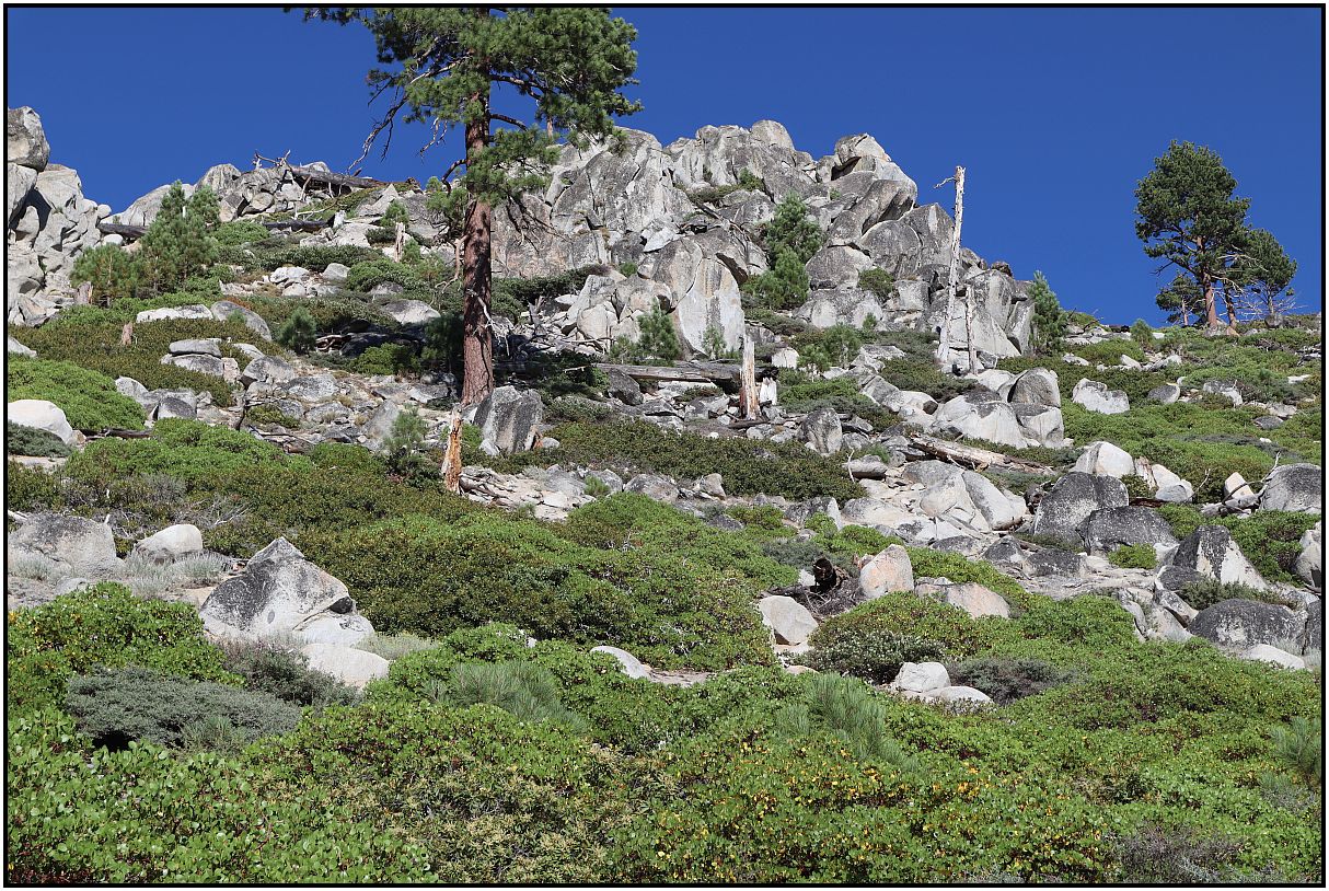 A few weeks ago while on vacation, I went on a hike in the mountains on the California-Nevada border. It was a beautiful day with blue sky. There was smoke from wildfires behind me, but I avoided taking pictures of that. At the higher elevations it was nice.
