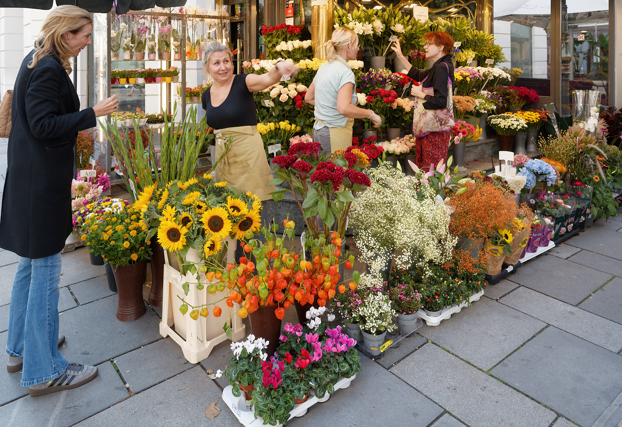 Between these two buildings and around the corner is a flower stall -- lovely flowers, but not cheap!